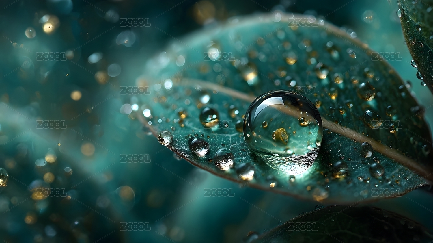 晶莹剔透水珠映绿叶 微观世界