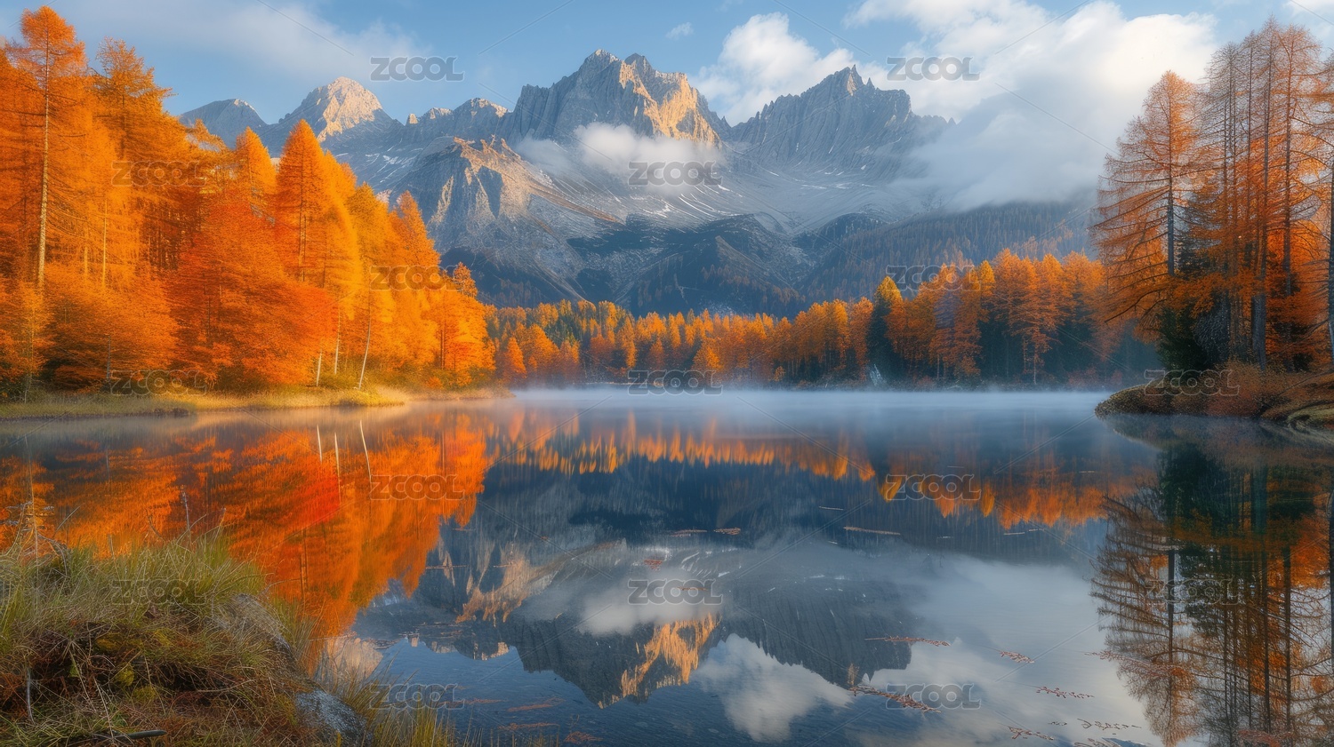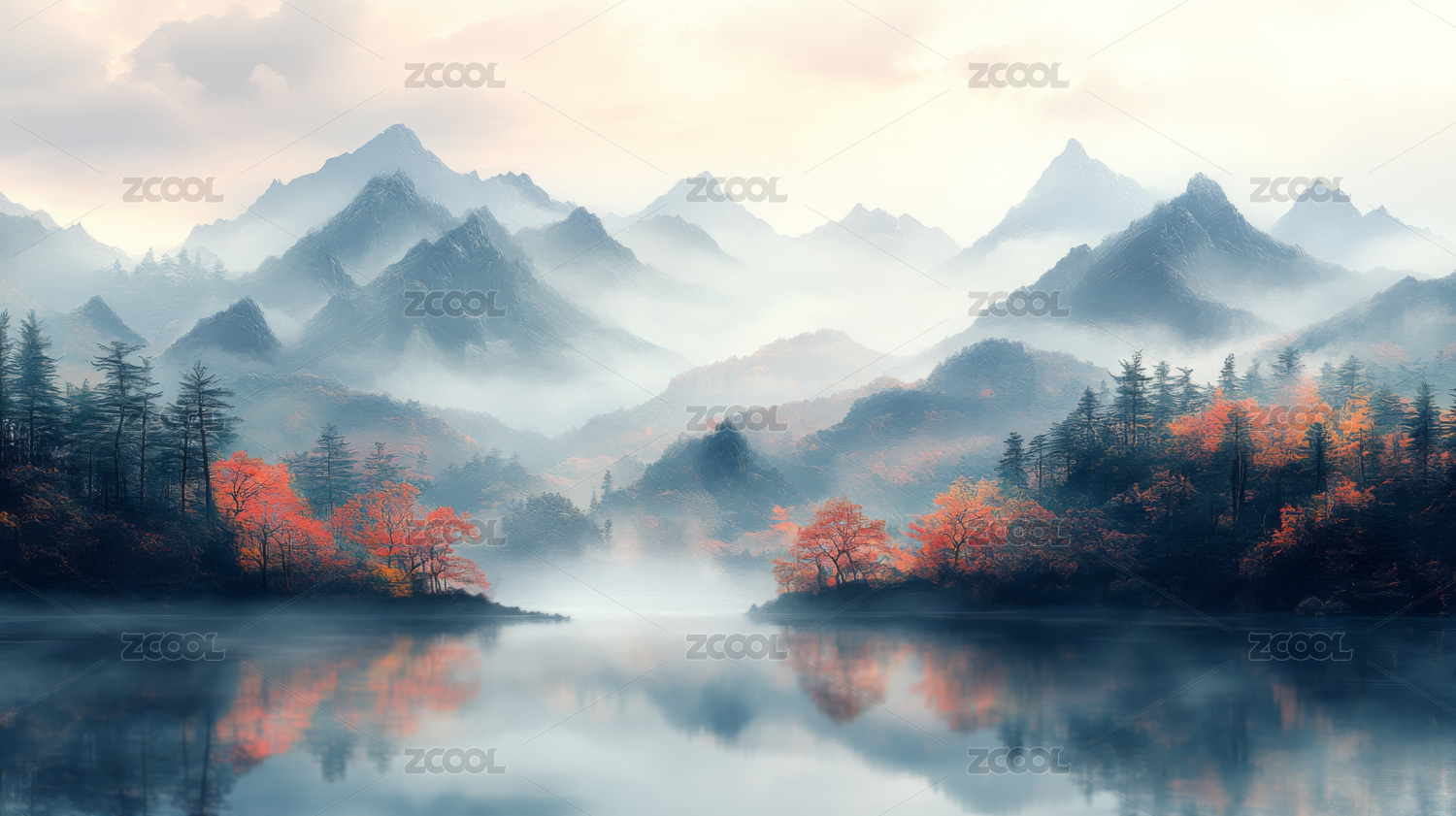 山水,秋日,湖泊,山脉,倒影,树木,晨雾,天空,云朵,色彩