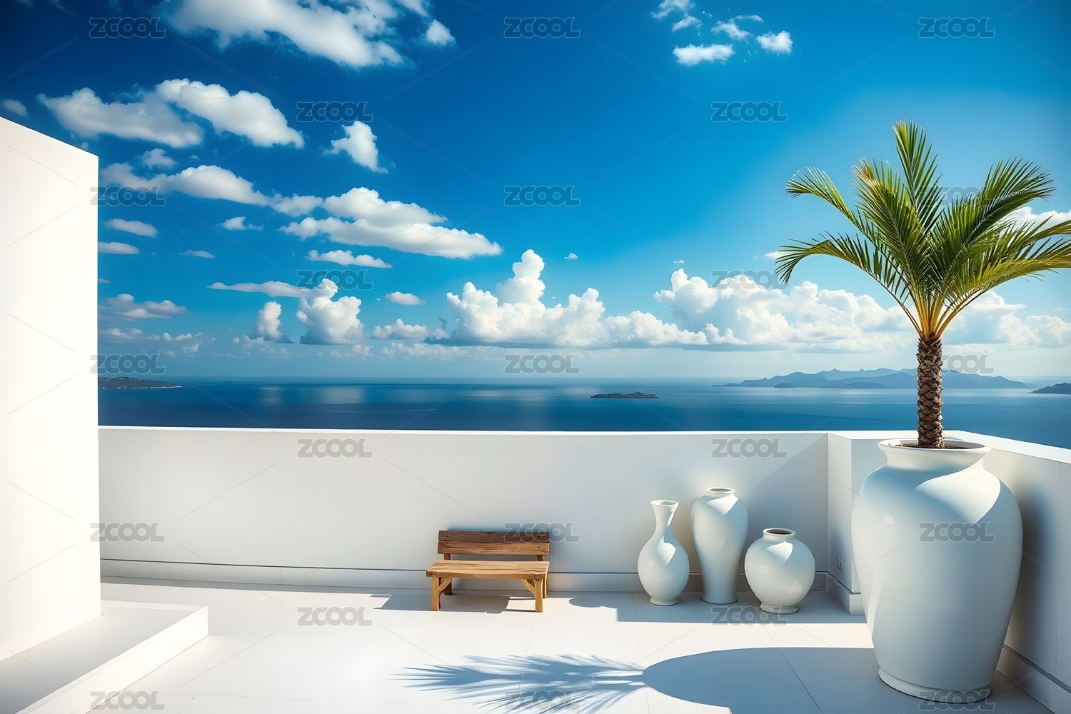 阳台,海景,城市,海岸线,蓝天,白云,木地板,护栏,远山,高楼