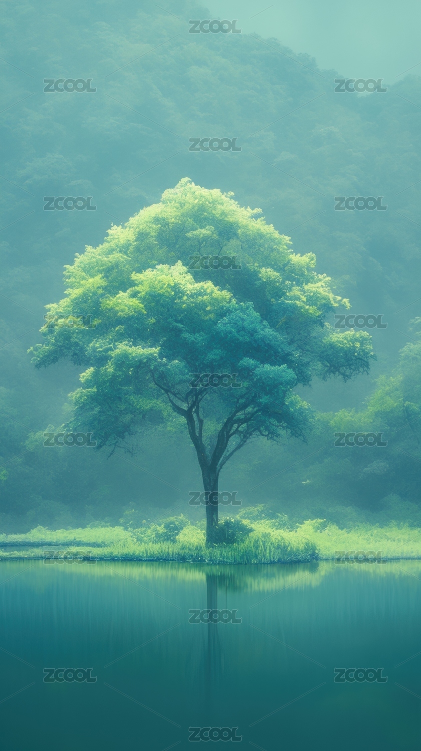 湖畔孤树绿意盎然