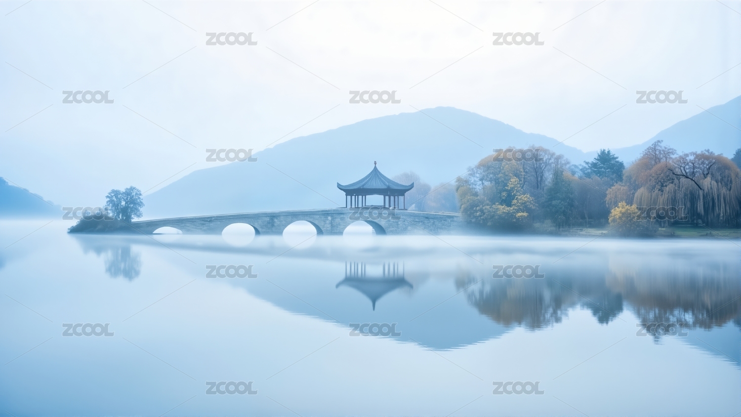 湖上石桥晨雾缭绕