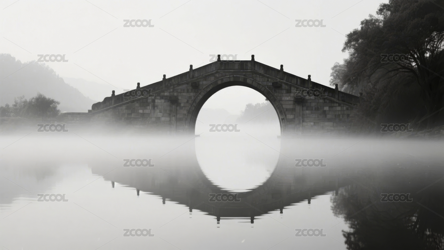 晨雾中的拱桥倒影