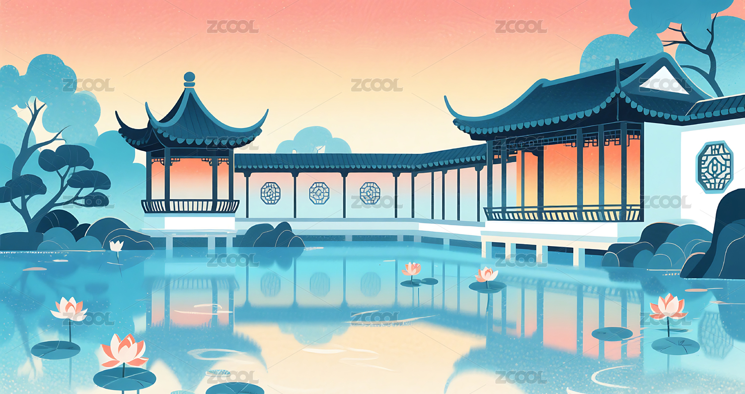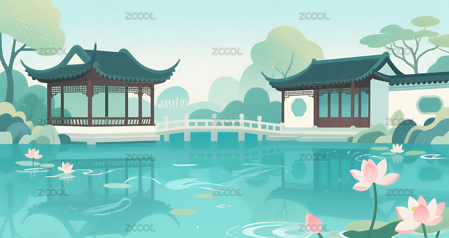 中式,园林,插画,背景,壁纸,建筑,传统,湖水,荷花
