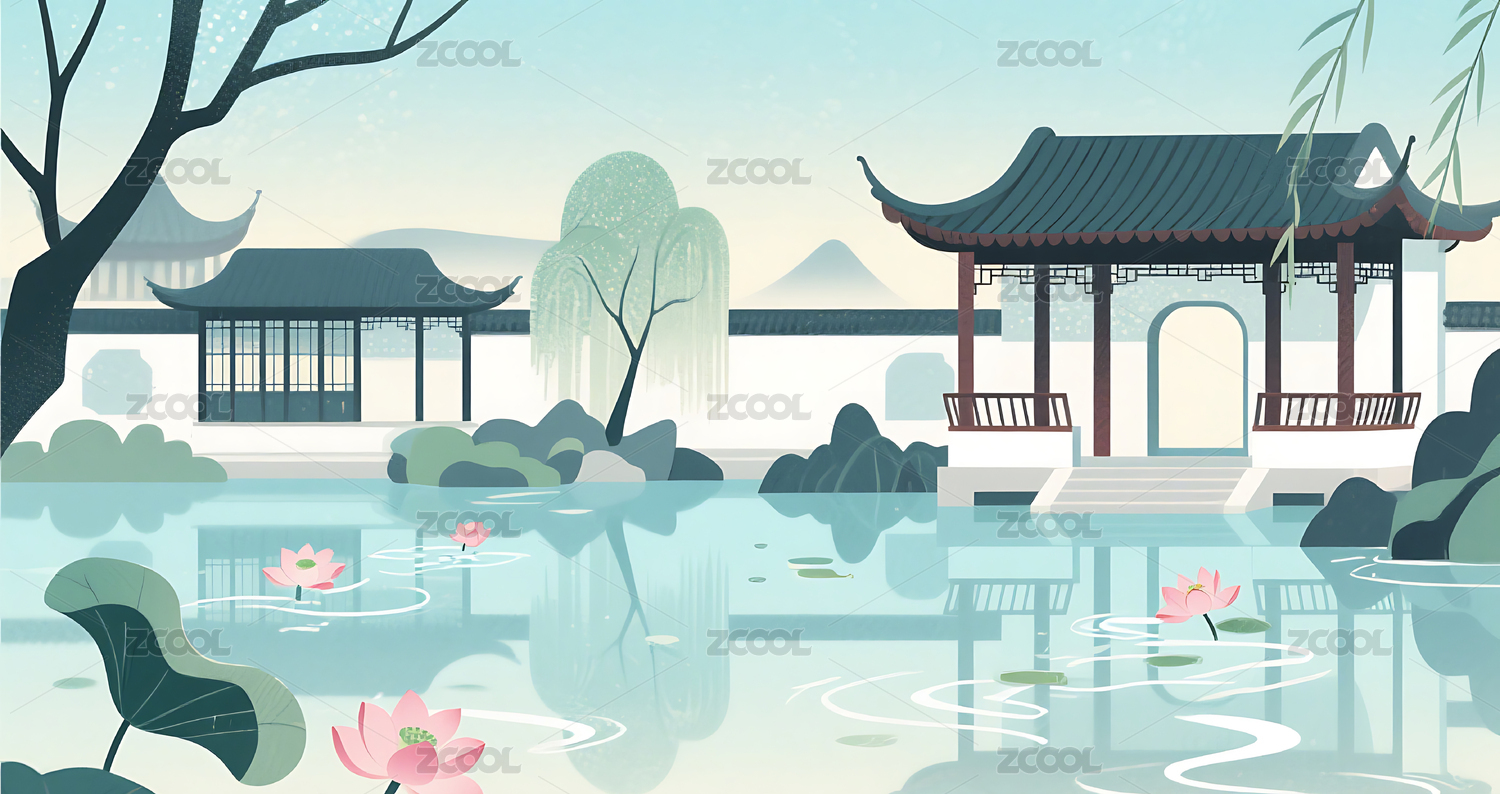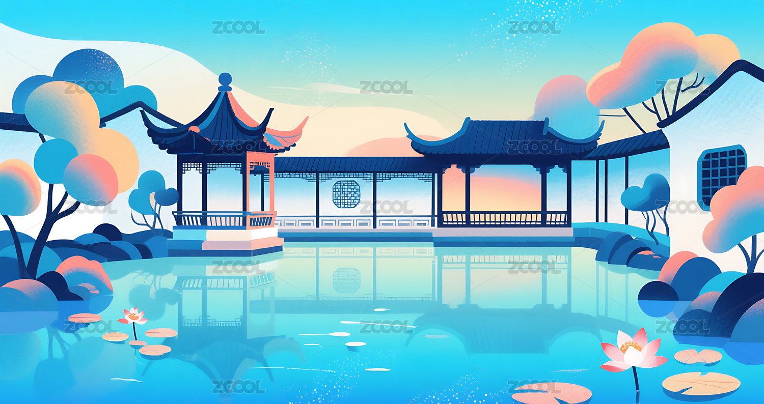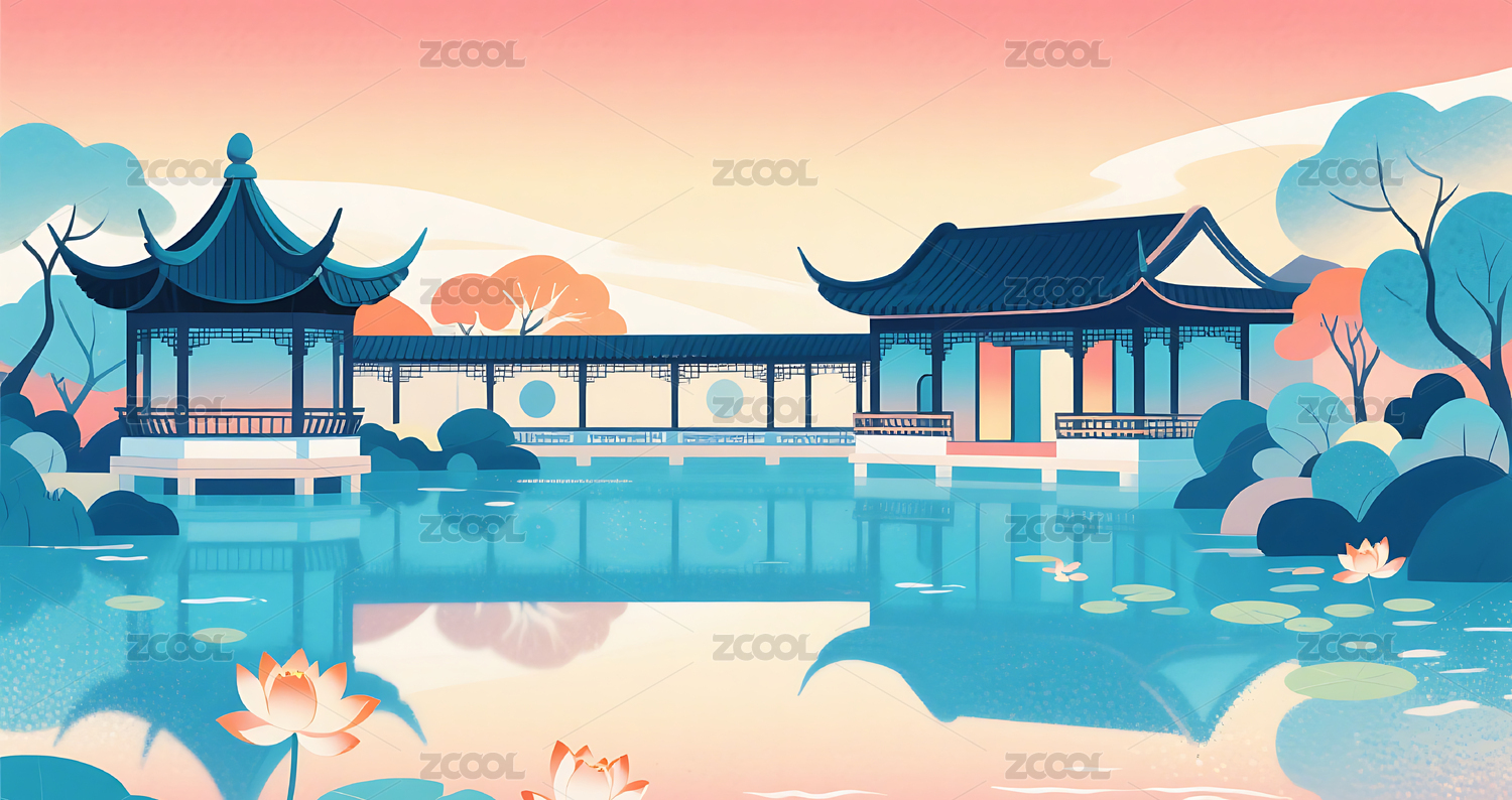 中式,园林,插画,背景,壁纸,建筑,传统,湖水,荷花