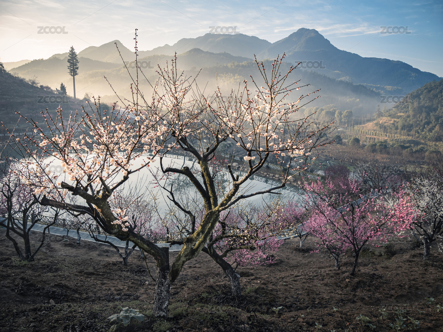 安徽歙县卖花渔村春天梅花开晨雾日出