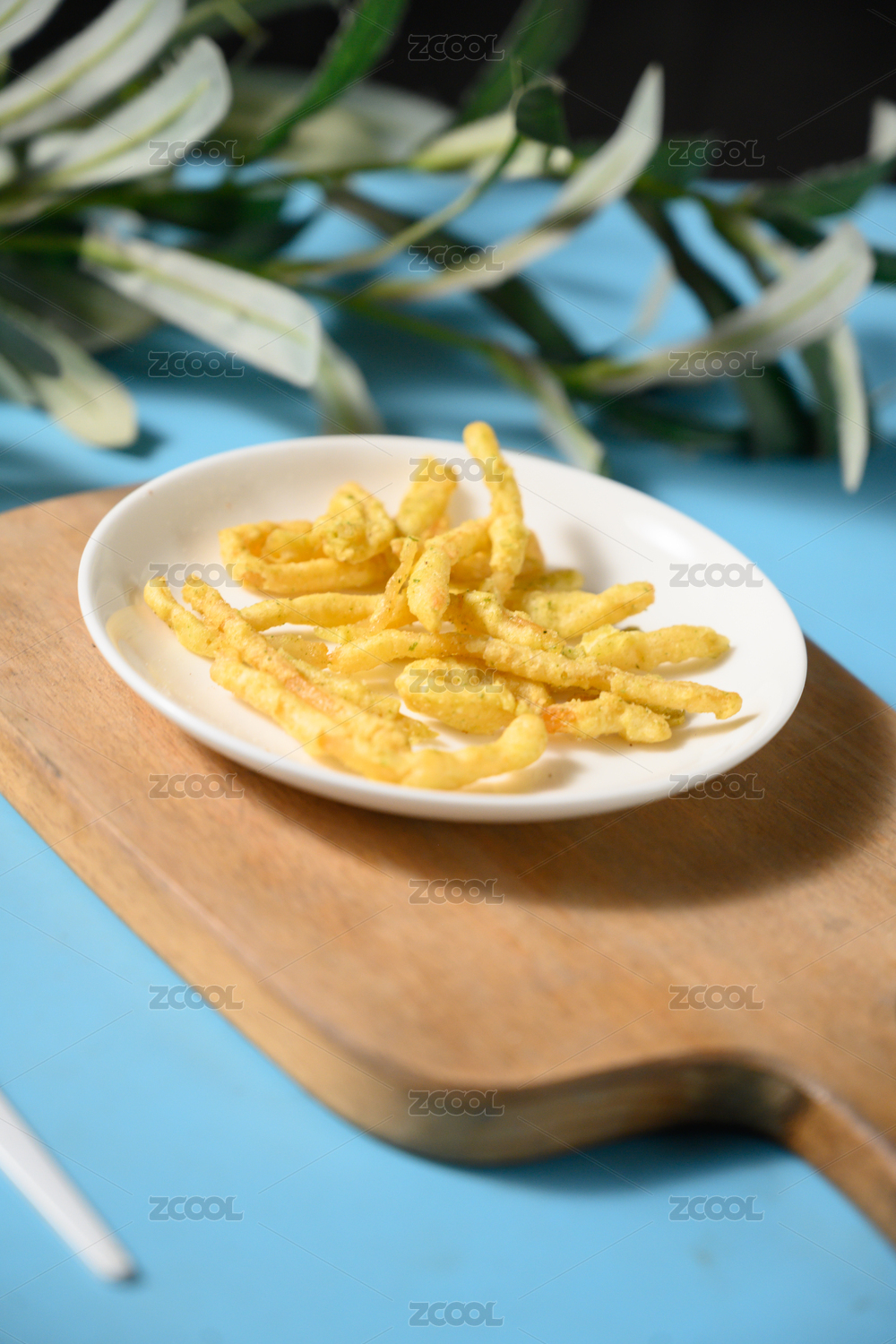 桌面上的盘子里的美味可口的油炸鱿鱼丝