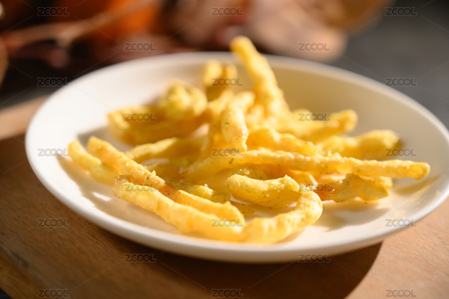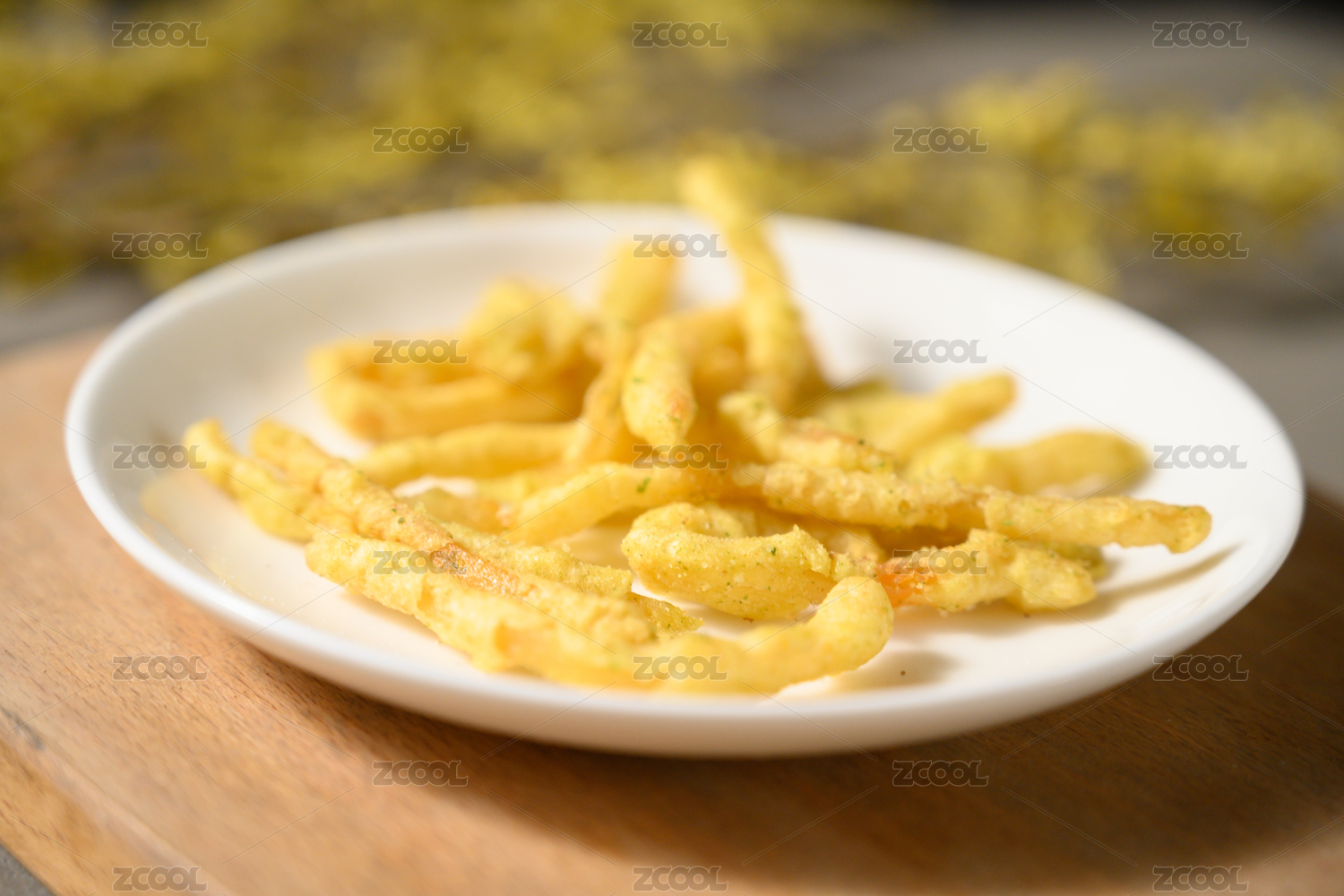 桌面上的盘子里的美味可口的油炸鱿鱼丝