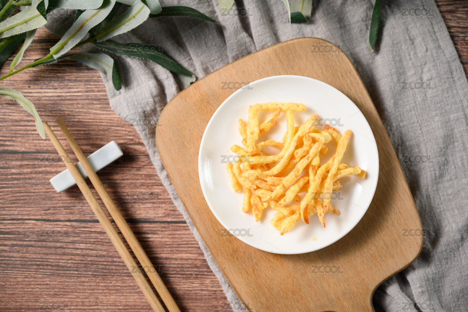 桌面上的盘子里的美味可口的油炸鱿鱼丝