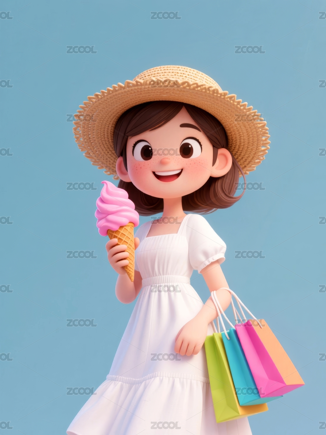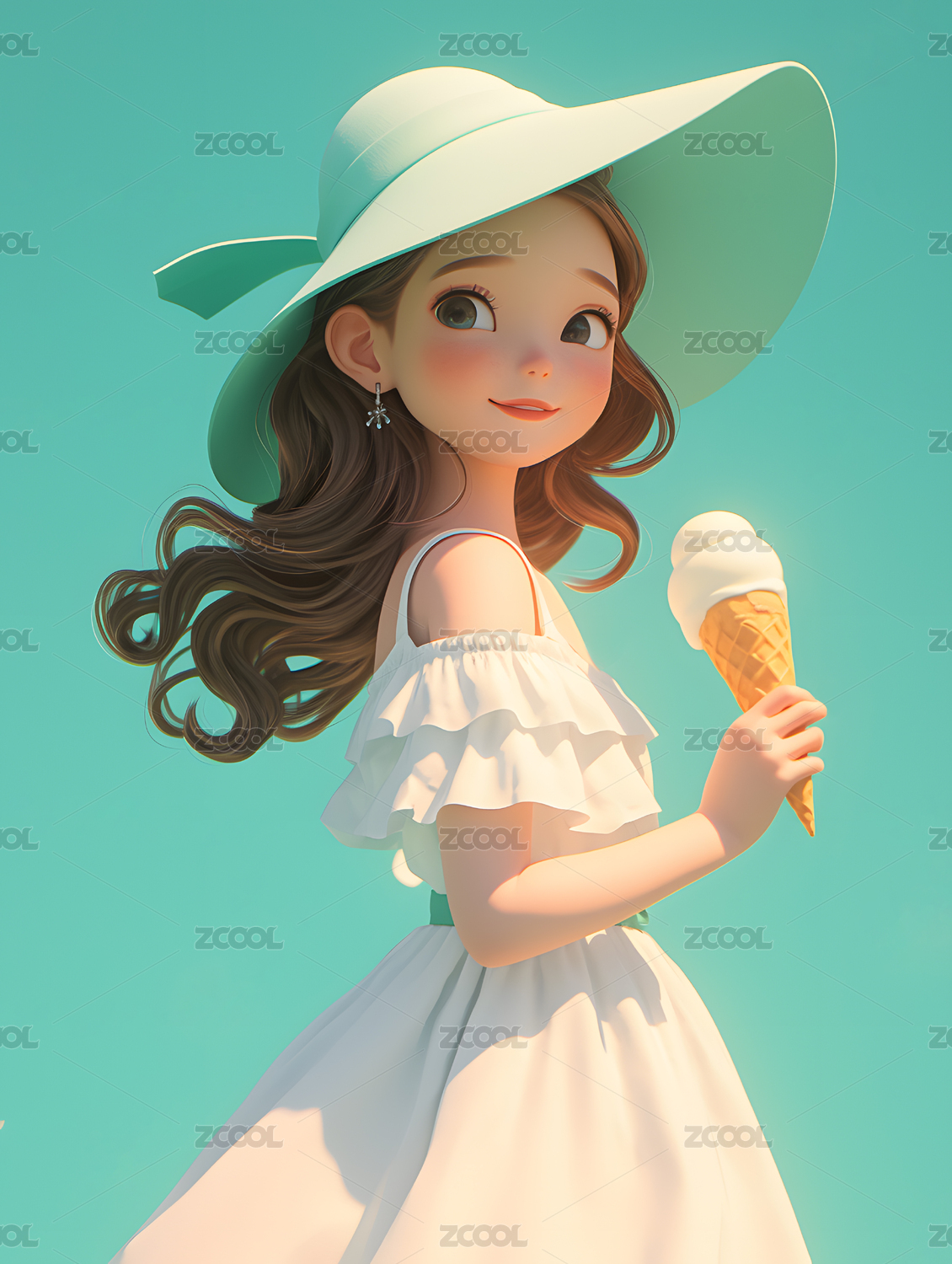 女孩,帽子,冰淇淋,夏日,甜美,动漫,可爱,清新,享受,3D