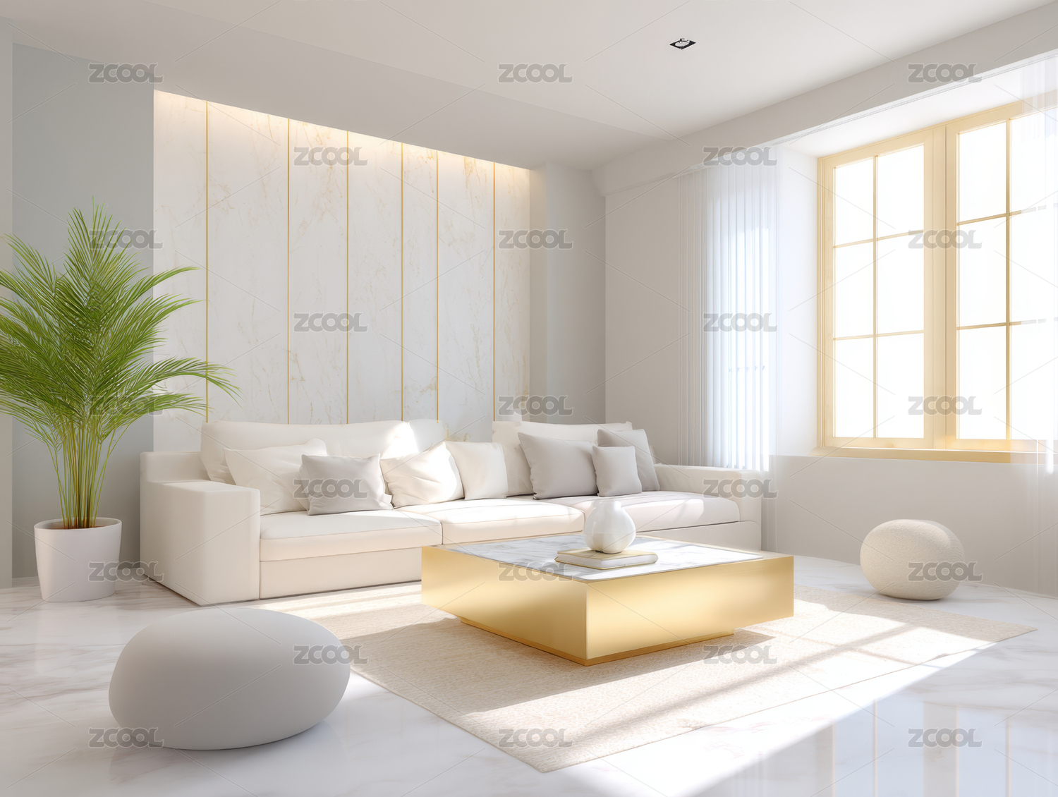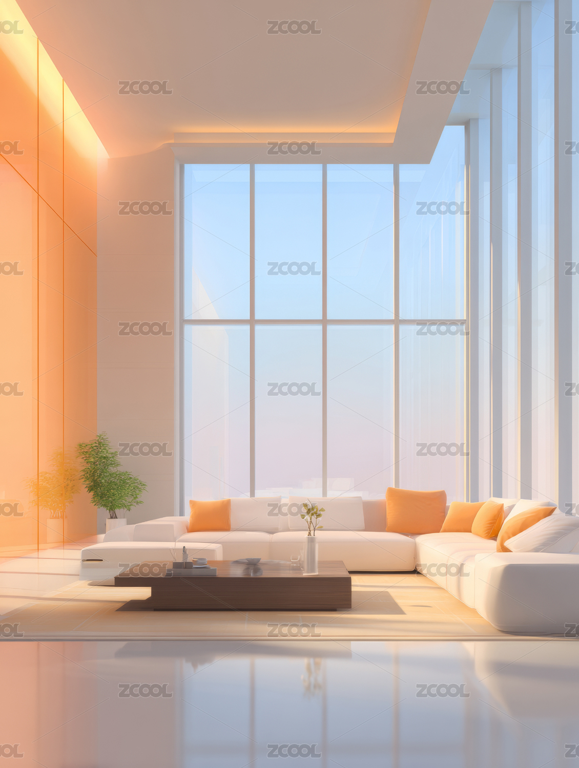室内明亮空间的简约沙发绿植景
