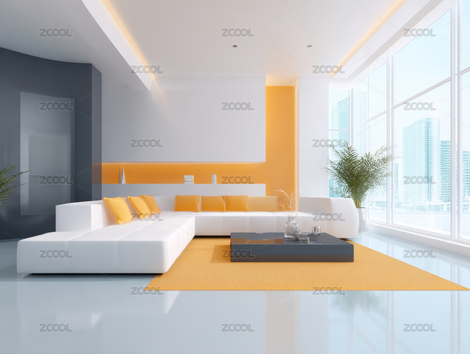 客厅,沙发,橙色,白色,装饰,窗户,城市,景观,现代,简洁