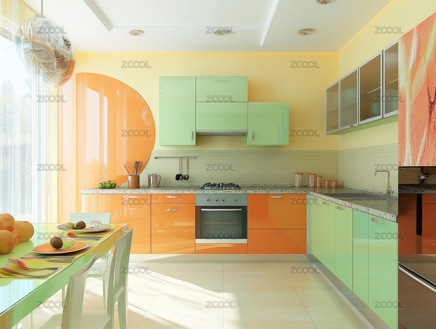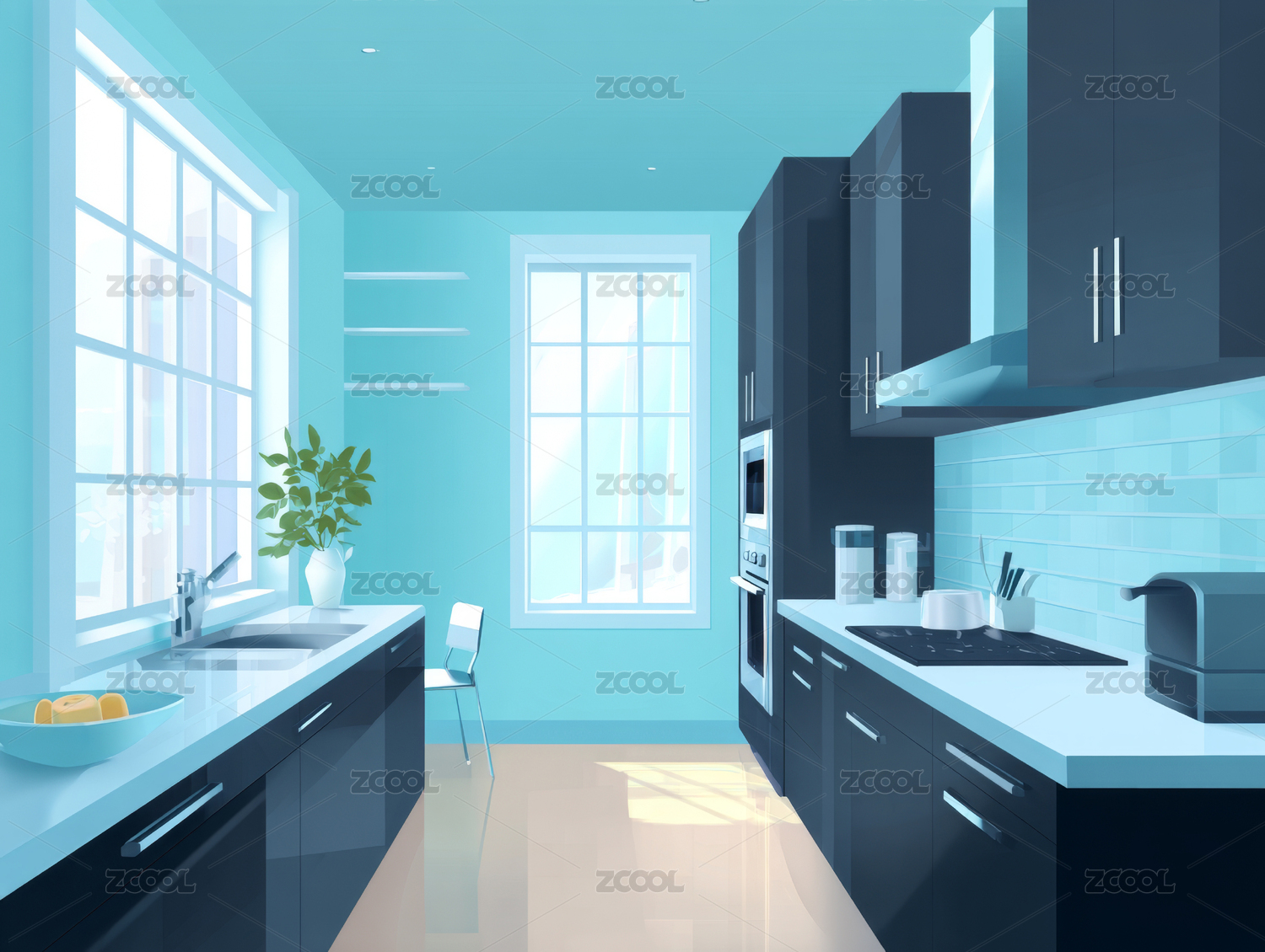 厨房,现代,橱柜,瓷砖,家电,窗户,植物,灯光,整洁,装修