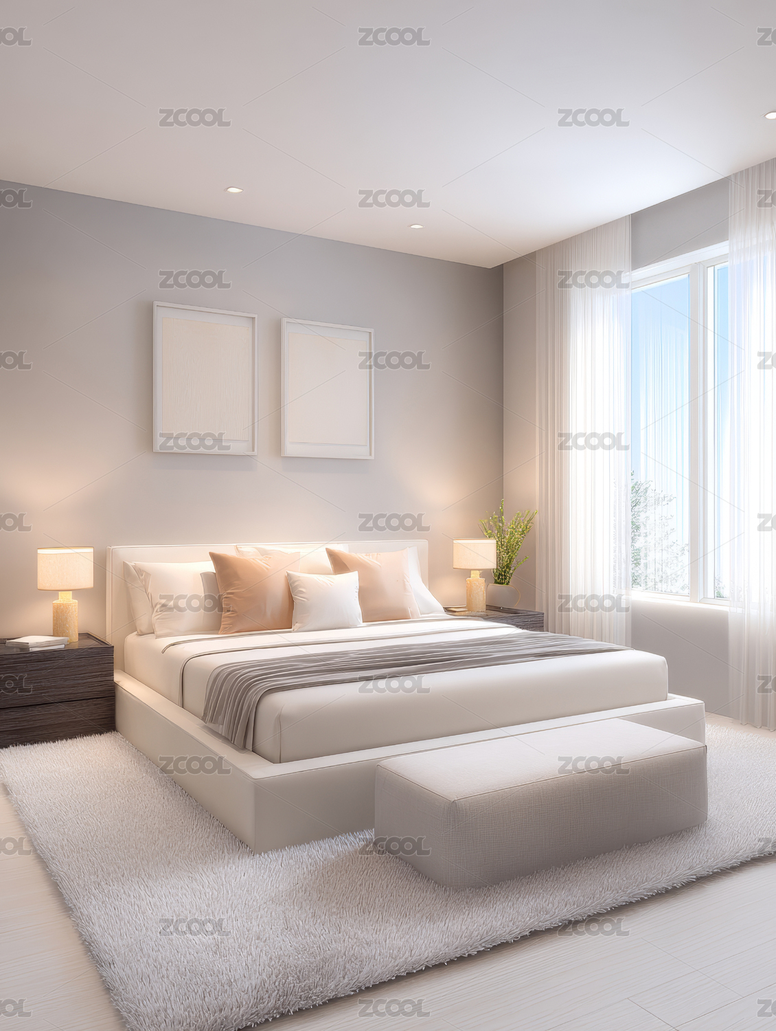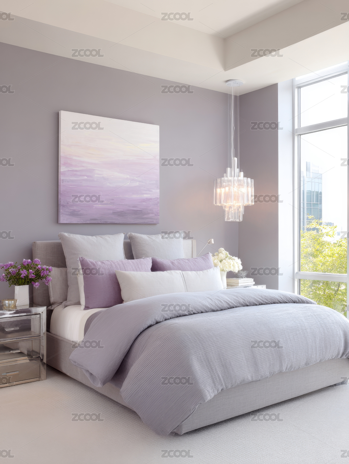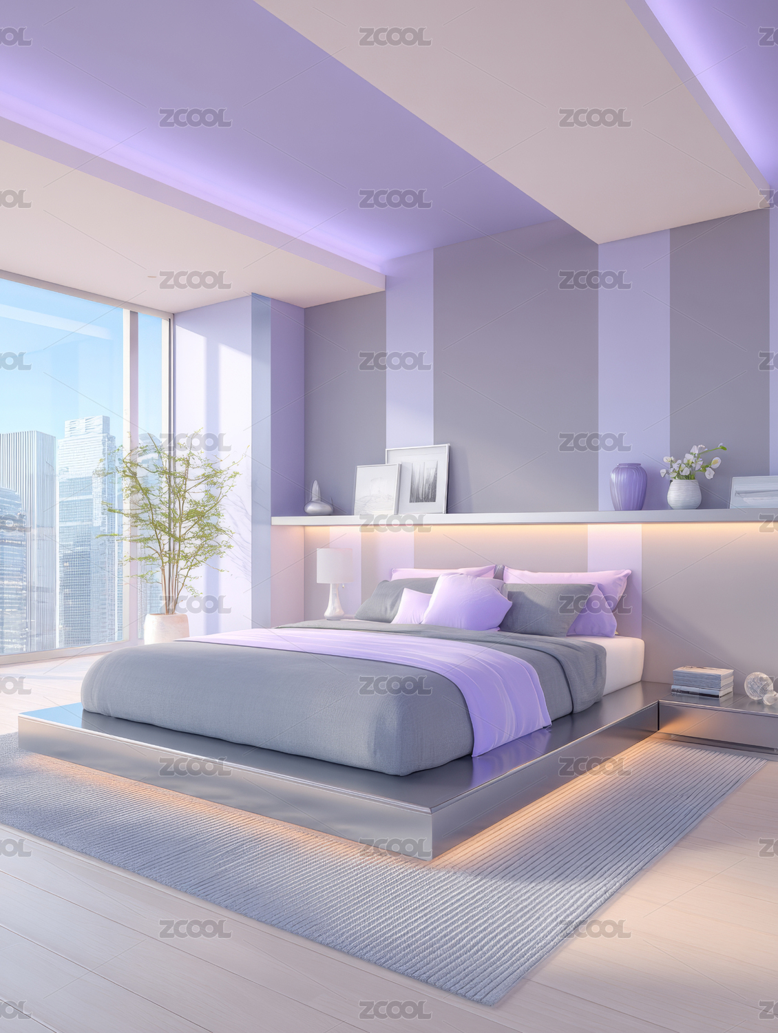 卧室,床,紫色,墙壁,装饰画,台灯,地毯,窗户,城市,景观