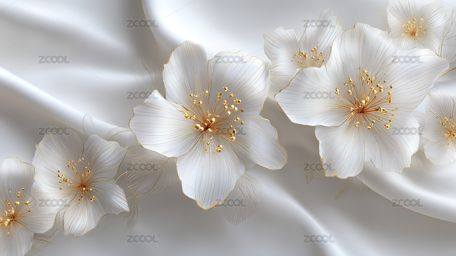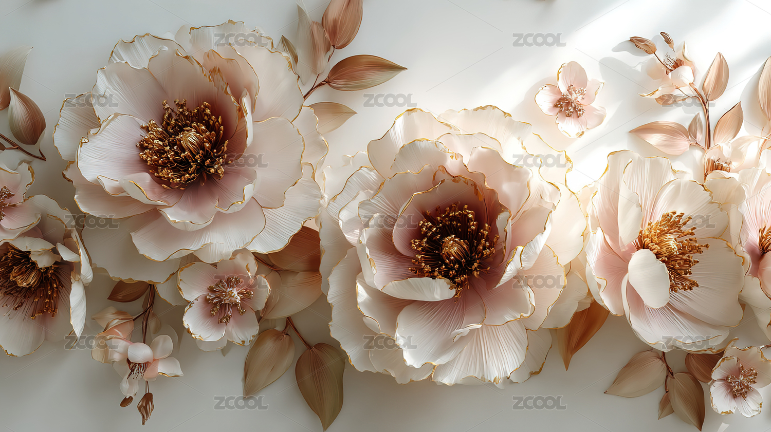 金色花朵和漩涡的立体白色背景