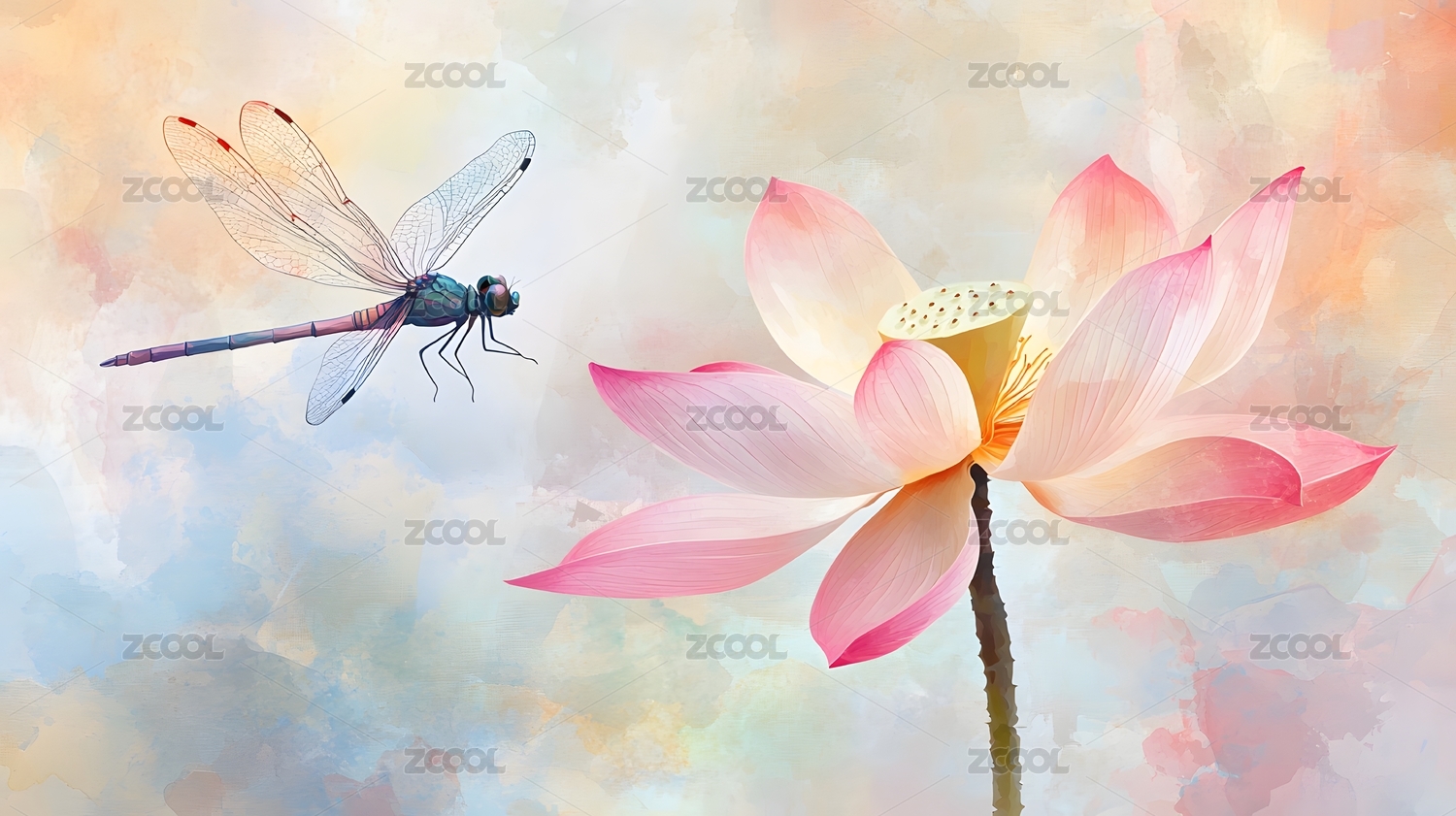 荷花和蜻蜓治愈插画