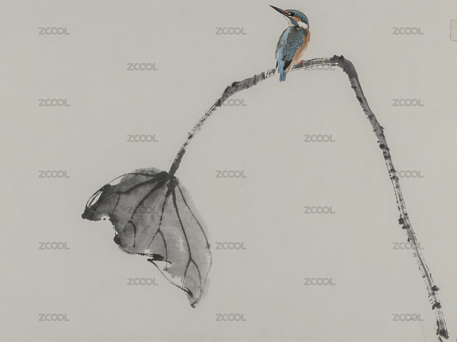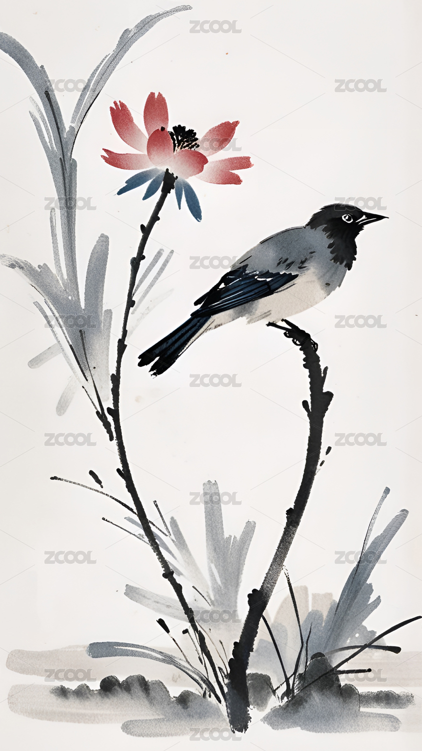 荷花和蝴蝶的水墨插图,一只鸟停在荷叶上