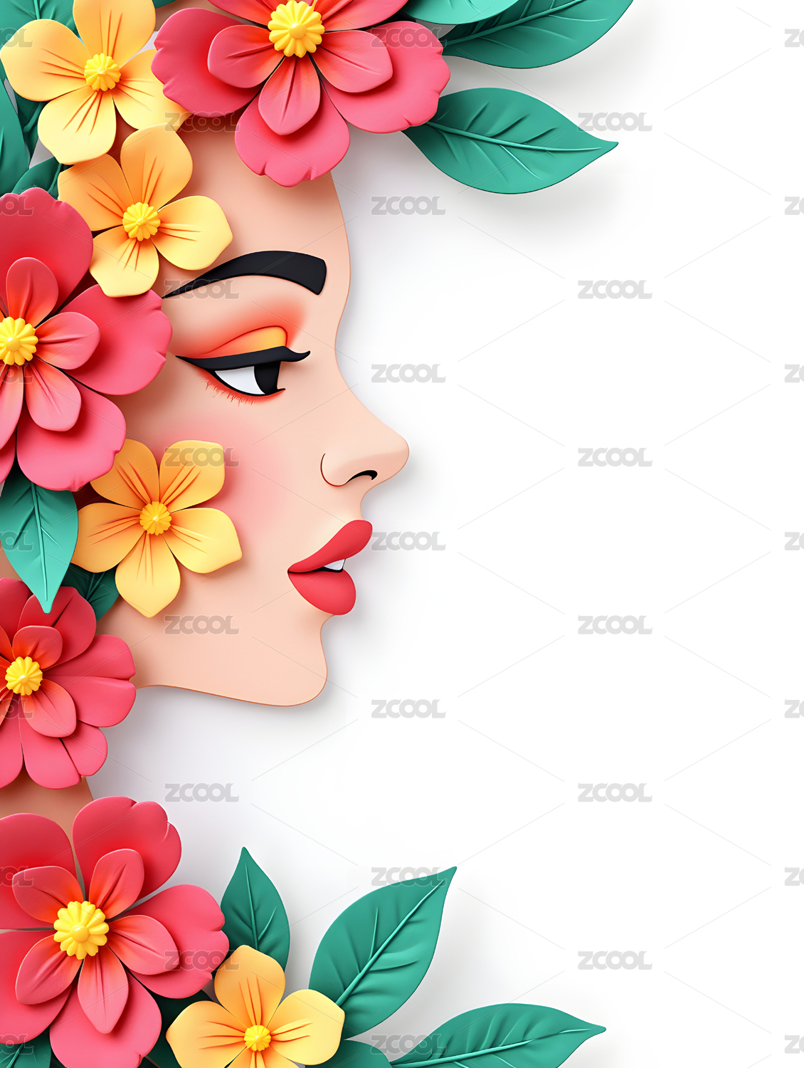 剪纸风格头戴鲜花的女人——三八妇女节海报