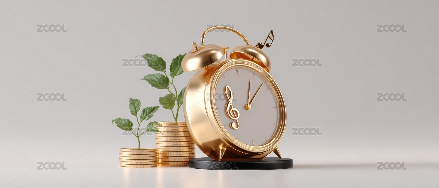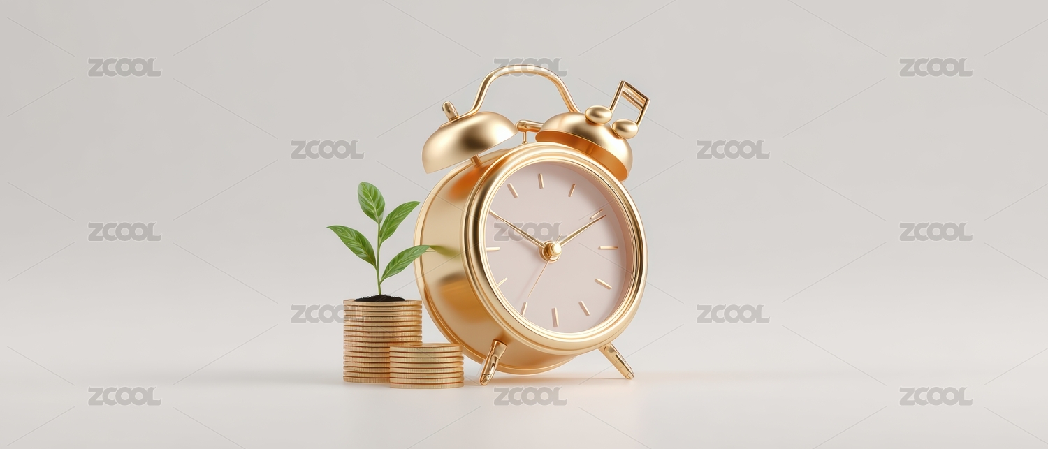 金色闹钟旁的硬币堆与嫩芽象征时间与成长