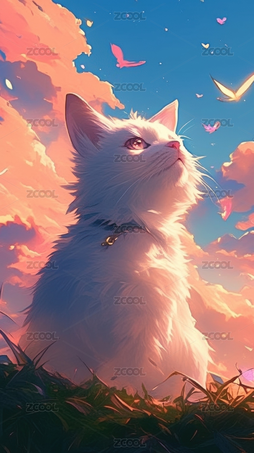 白猫仰望天空蝴蝶飞舞