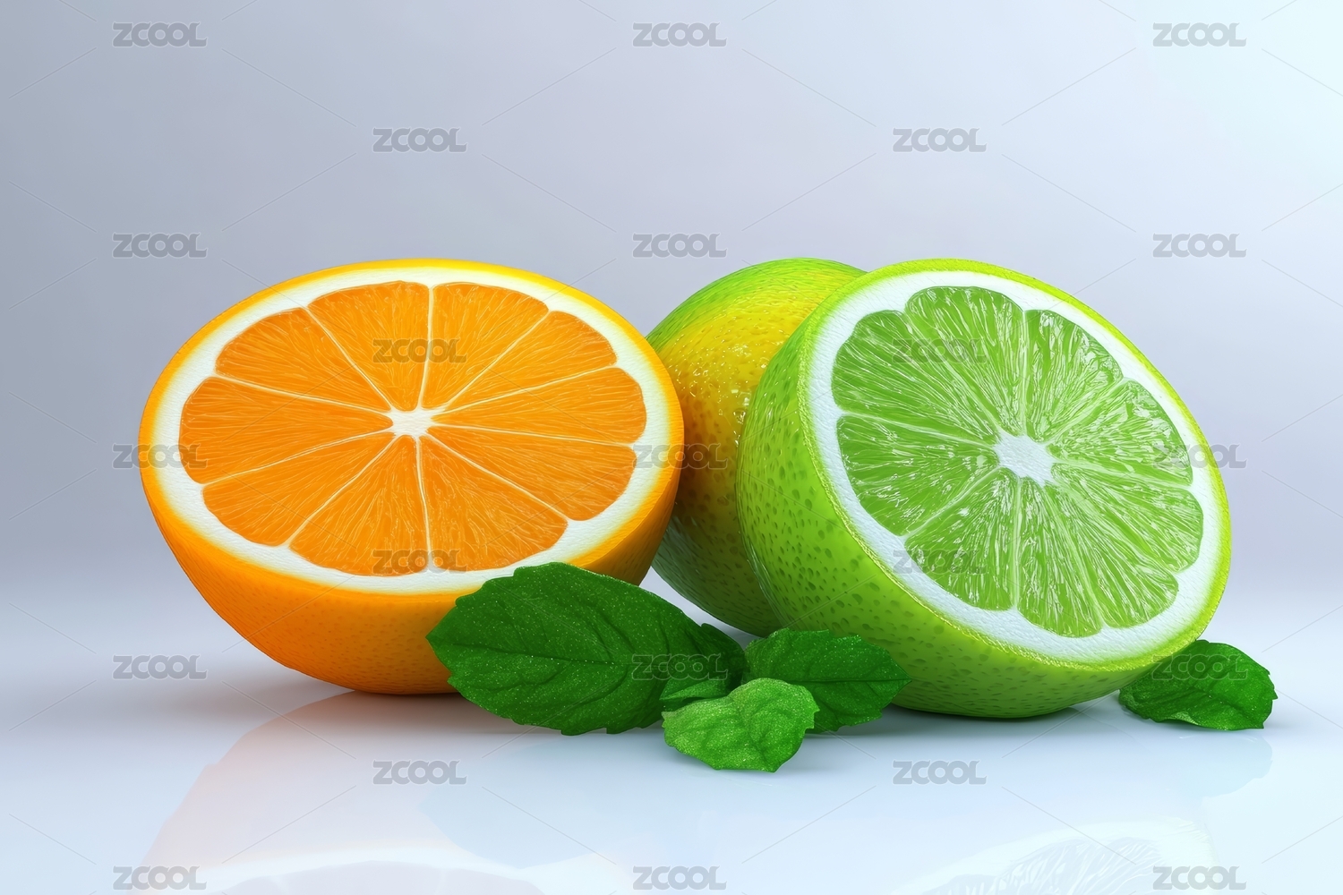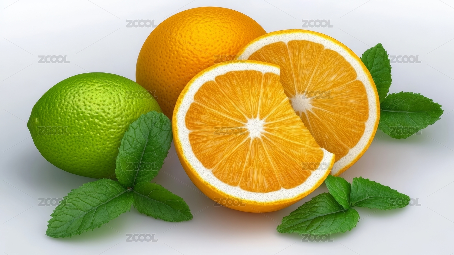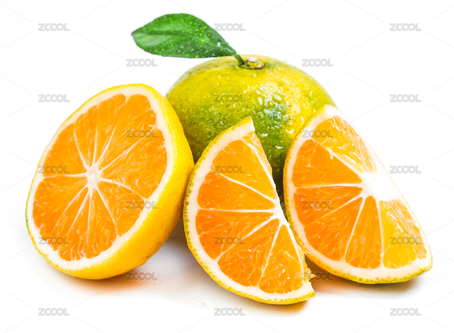 白底上的一个用叶子修饰的完整的橘子前放两瓣橘子