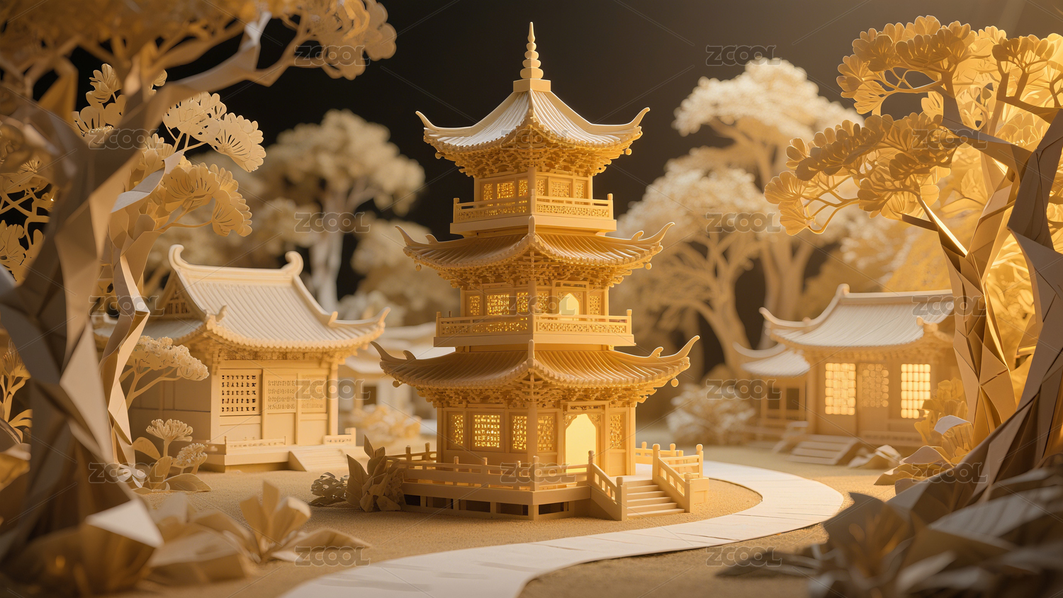 白色剪纸园林艺术建筑插画海报背景装饰画