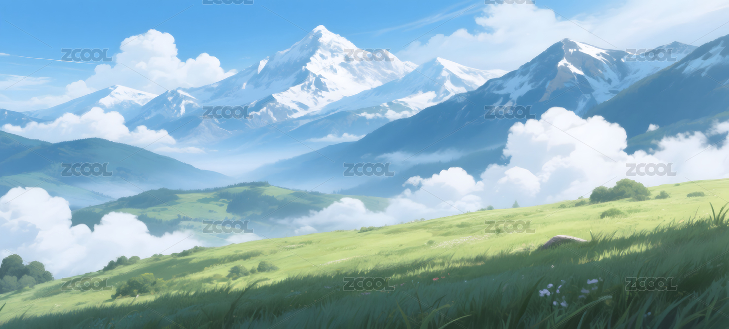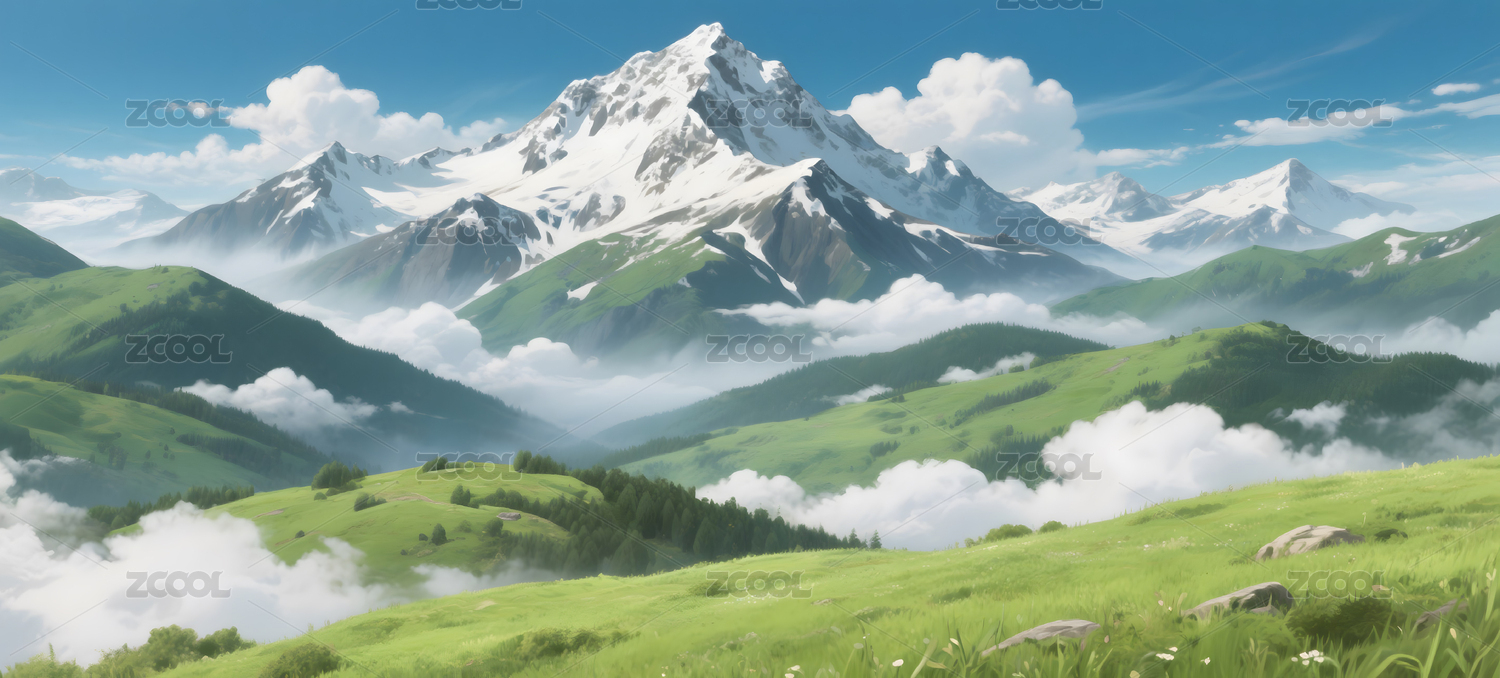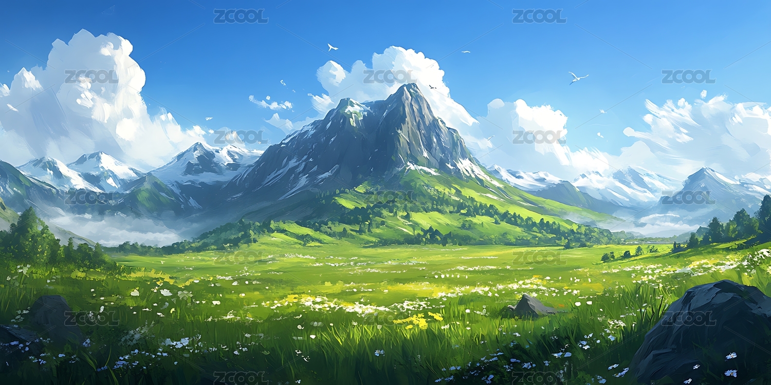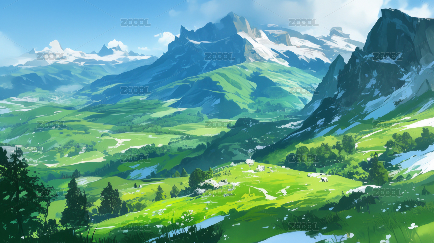 清新明亮绿色辽阔草原起伏的雪山插画绘画