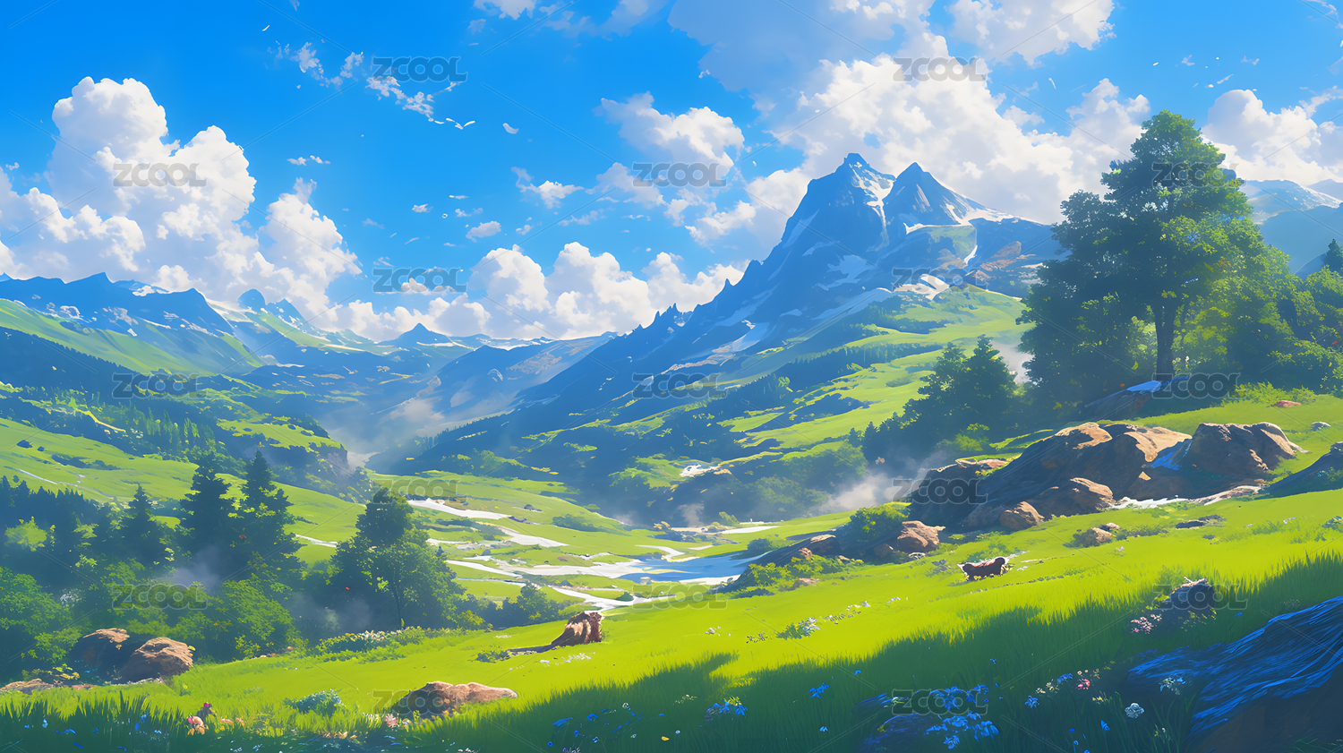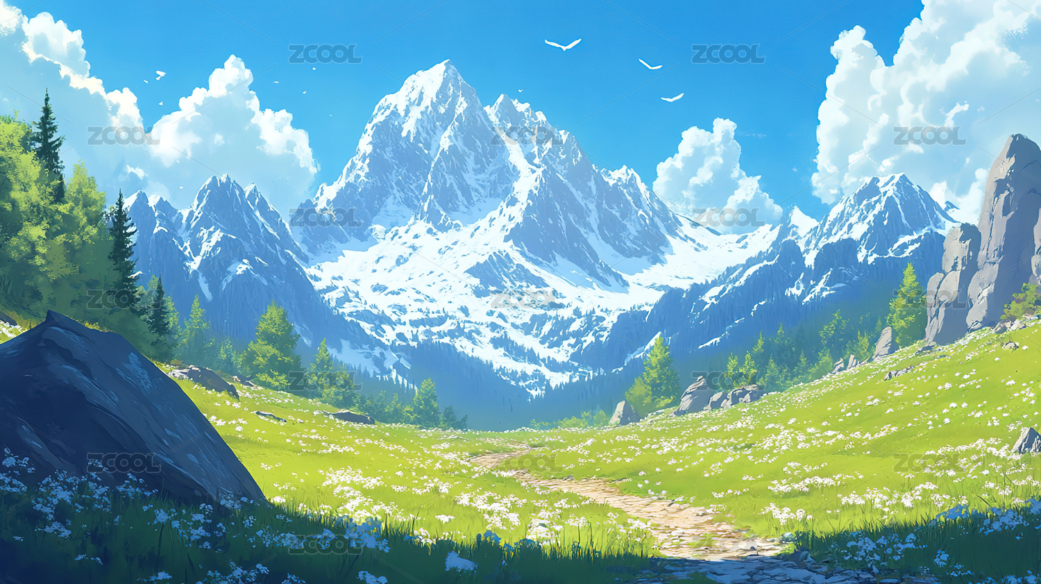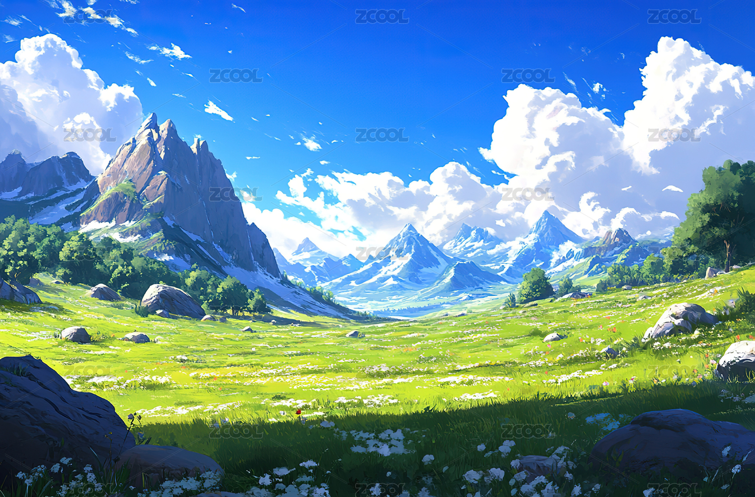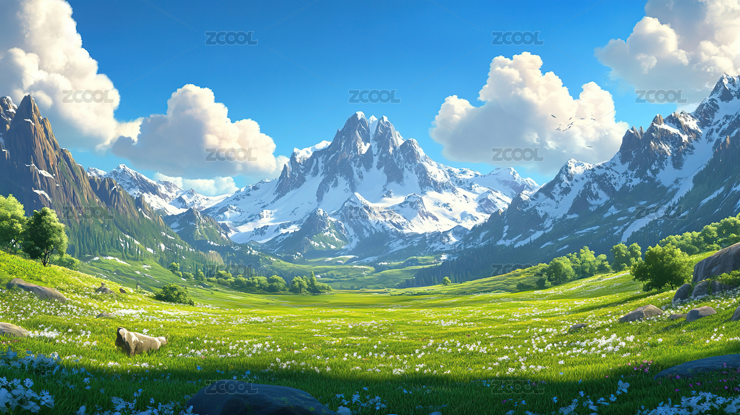 清新明亮绿色辽阔草原起伏的雪山插画绘画