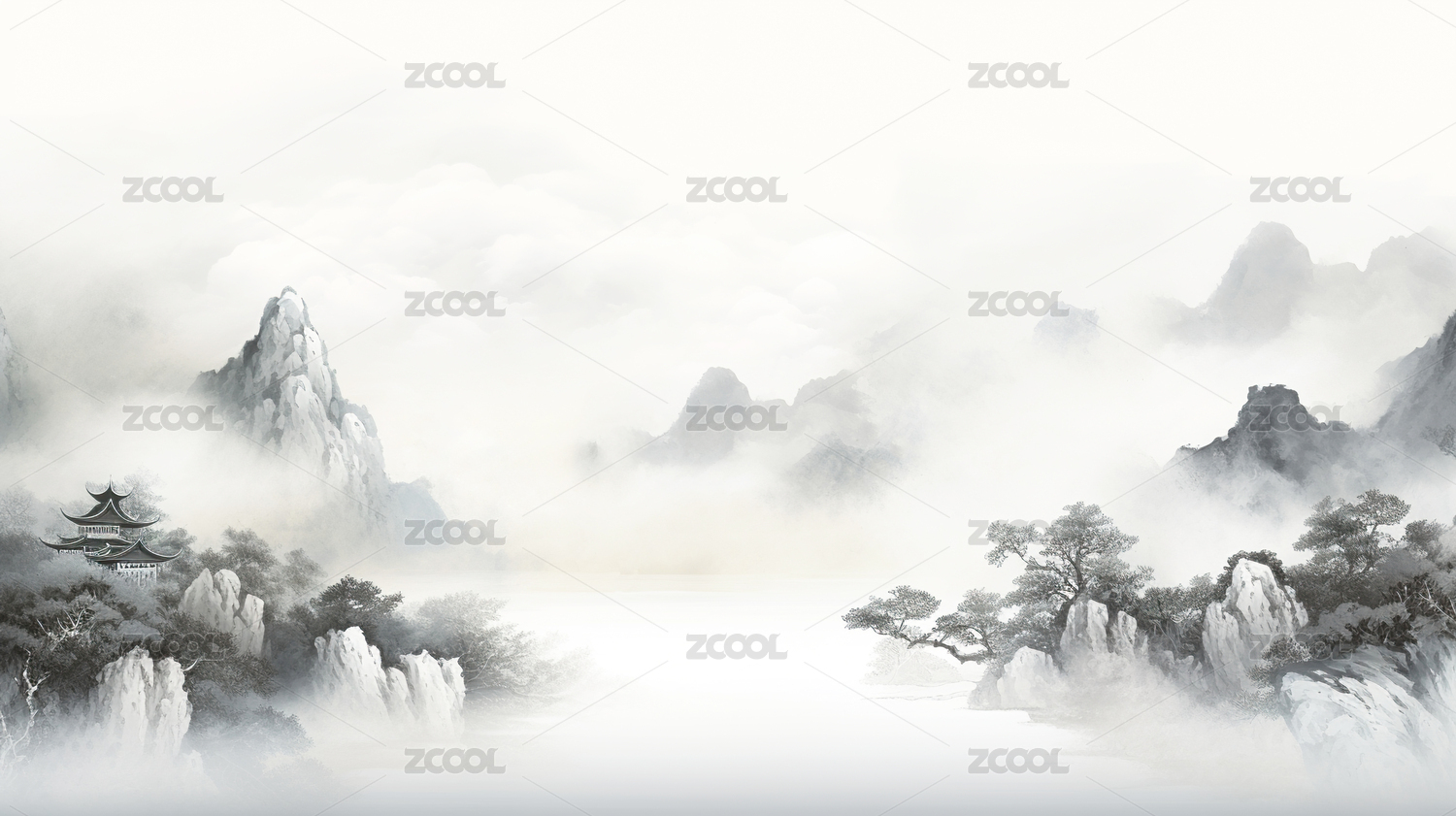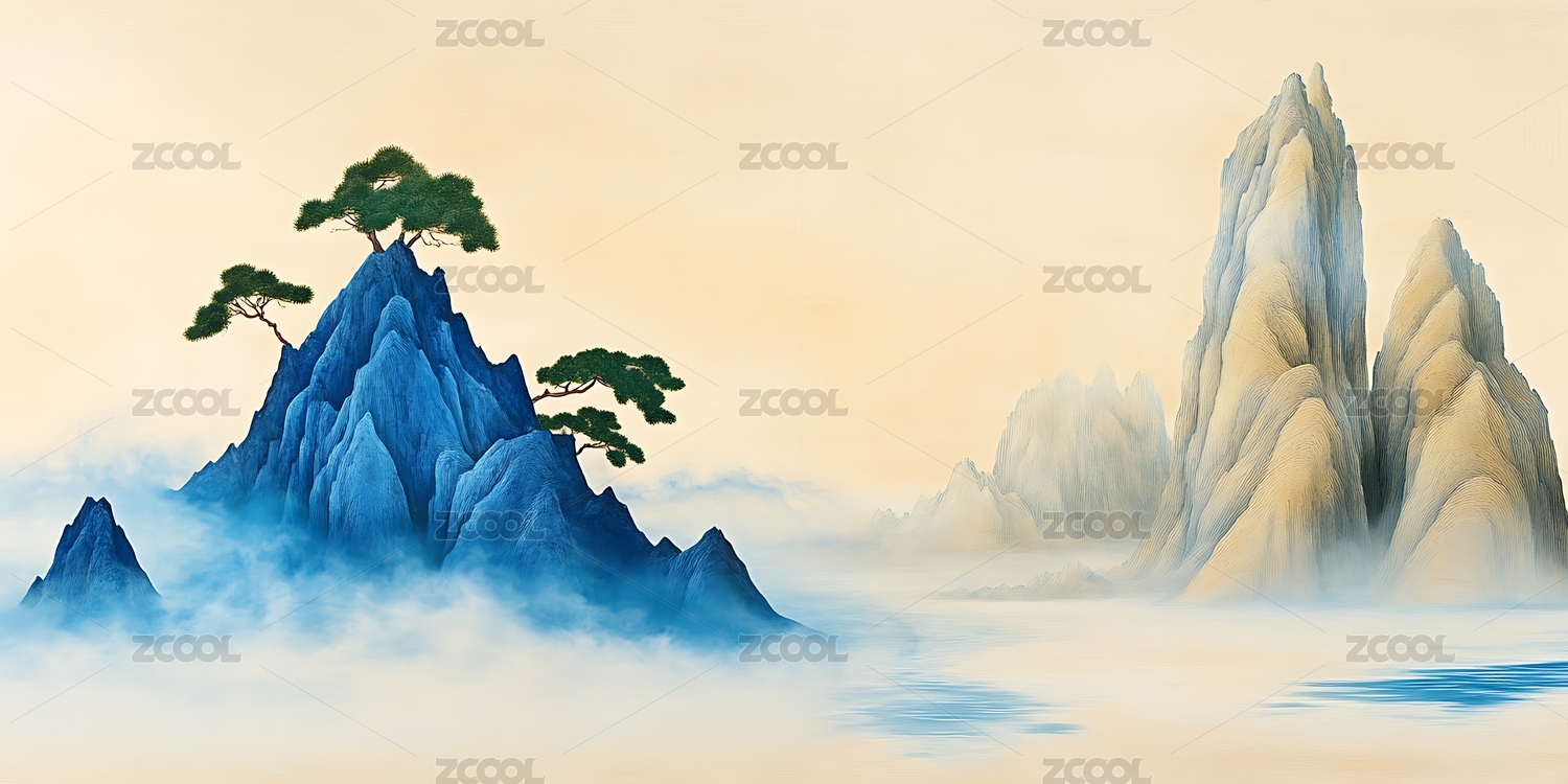 自然,宁静,蓝色,意境,水墨画,山水,山峰,湖水,倒影,云雾