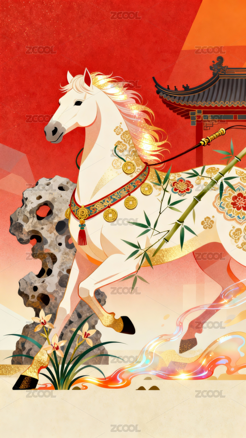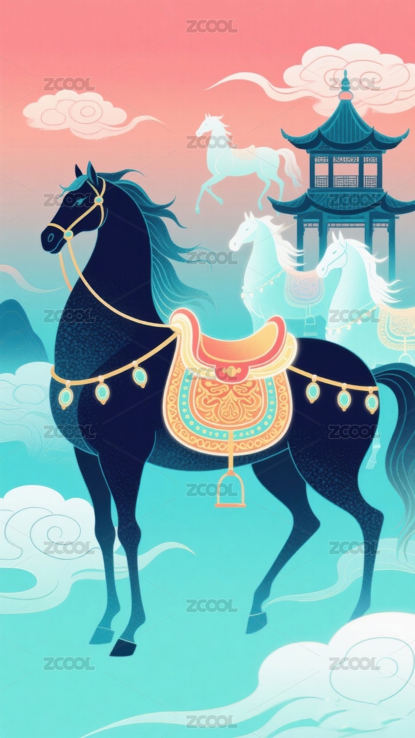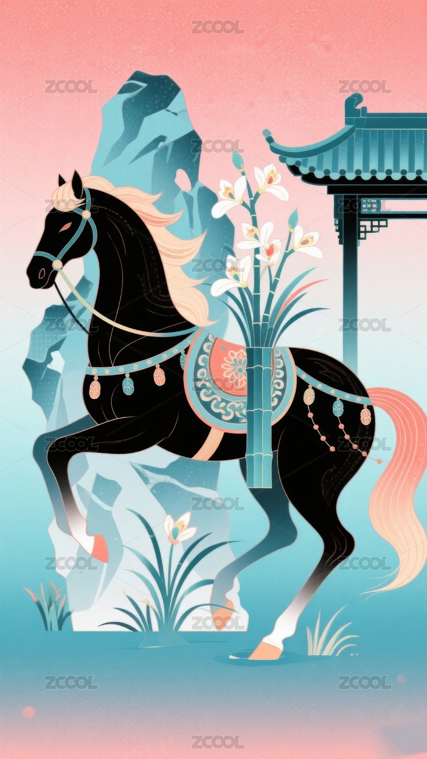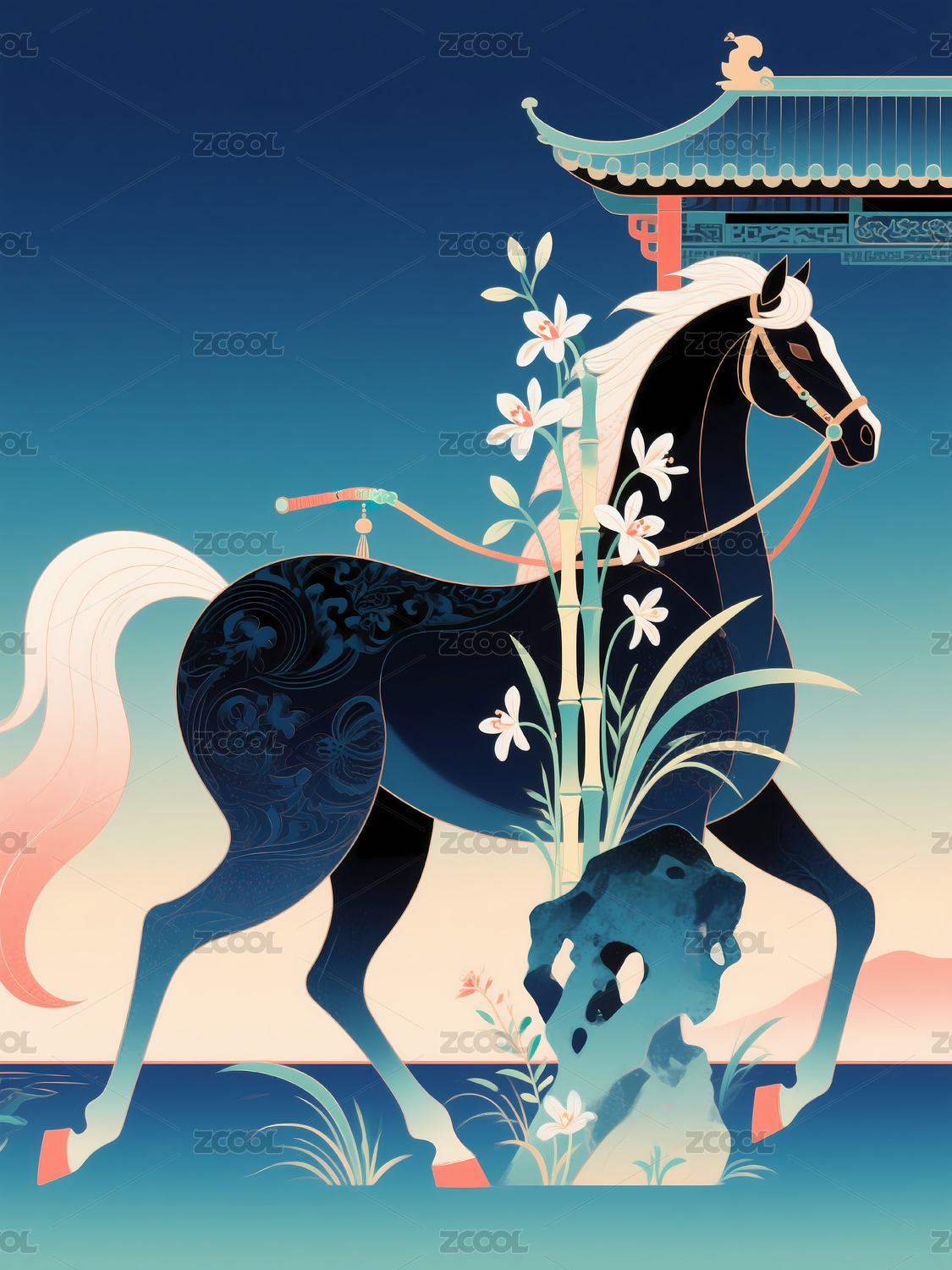 中国风,传统图案,装饰,马,奔马,国画,海报,设计,亭子,石头