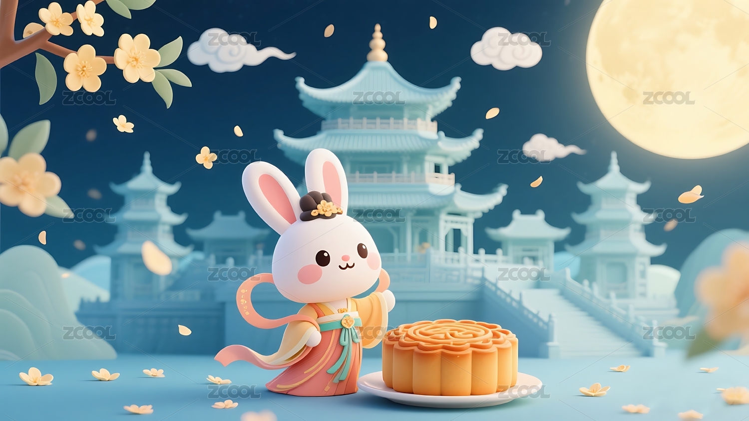 坐在月饼上的玉兔中秋月夜玉兔赏月
