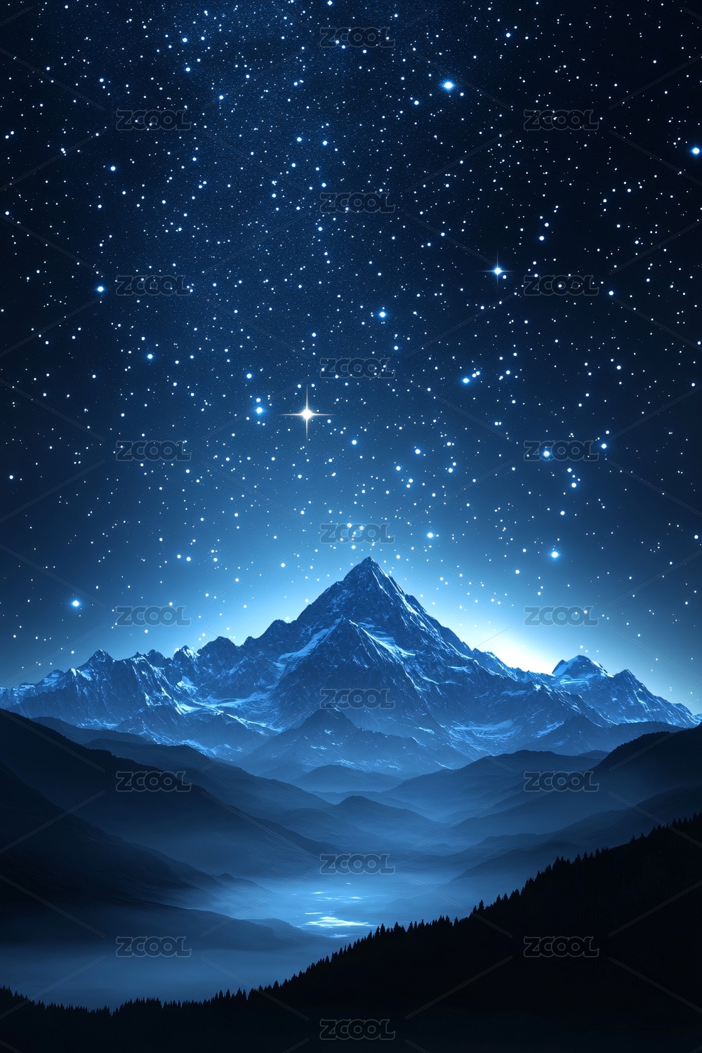 雪山,星空,山脉,雪景,奇幻,夜景,自然景观,插画,美景,天空