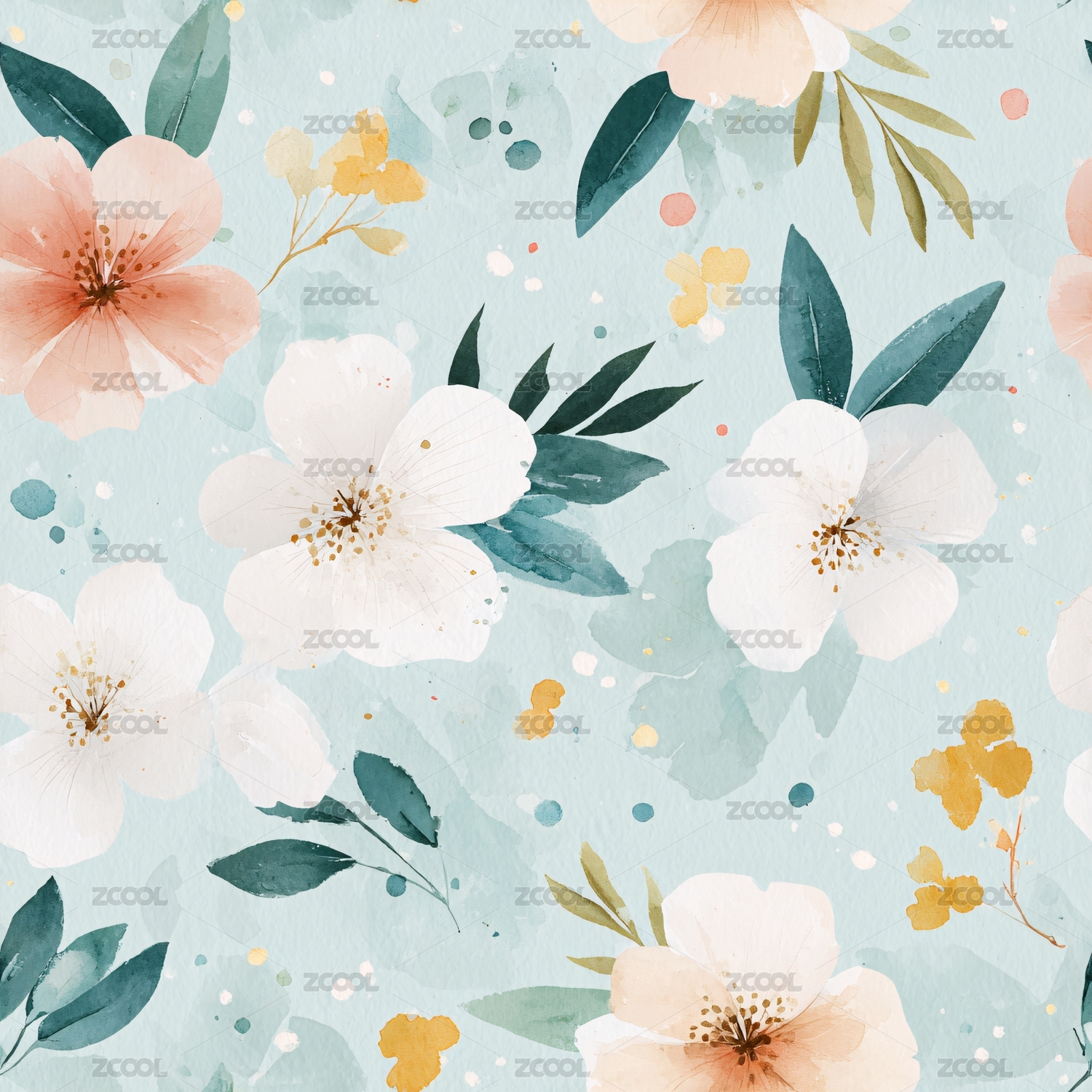 花卉,叶子,水彩,插画,图案,粉色,绿色,白色,植物,元素
