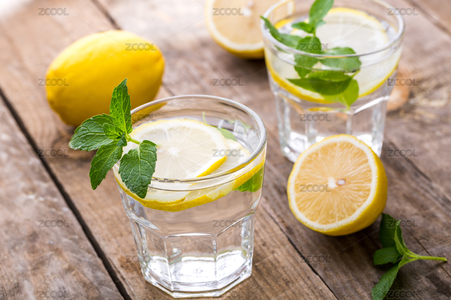 新鲜的柠檬水和薄荷叶在室内的桌子上,切开的柠檬片在玻璃杯里