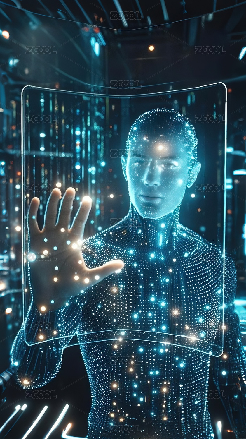 AI,人工智能,概念,科技,高科技,数字人,发光,信息流,举手,触摸