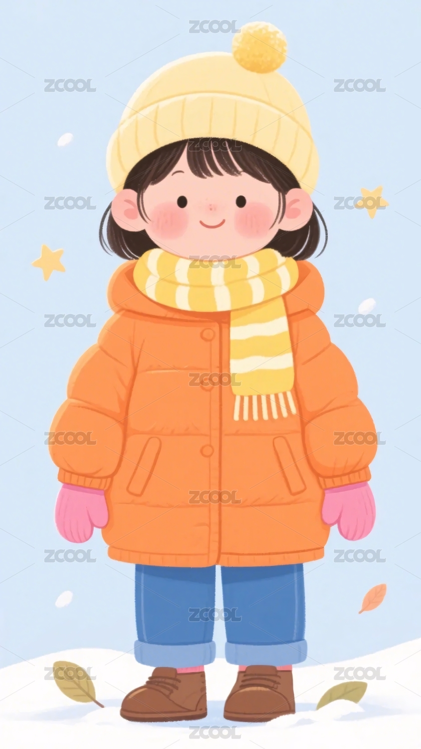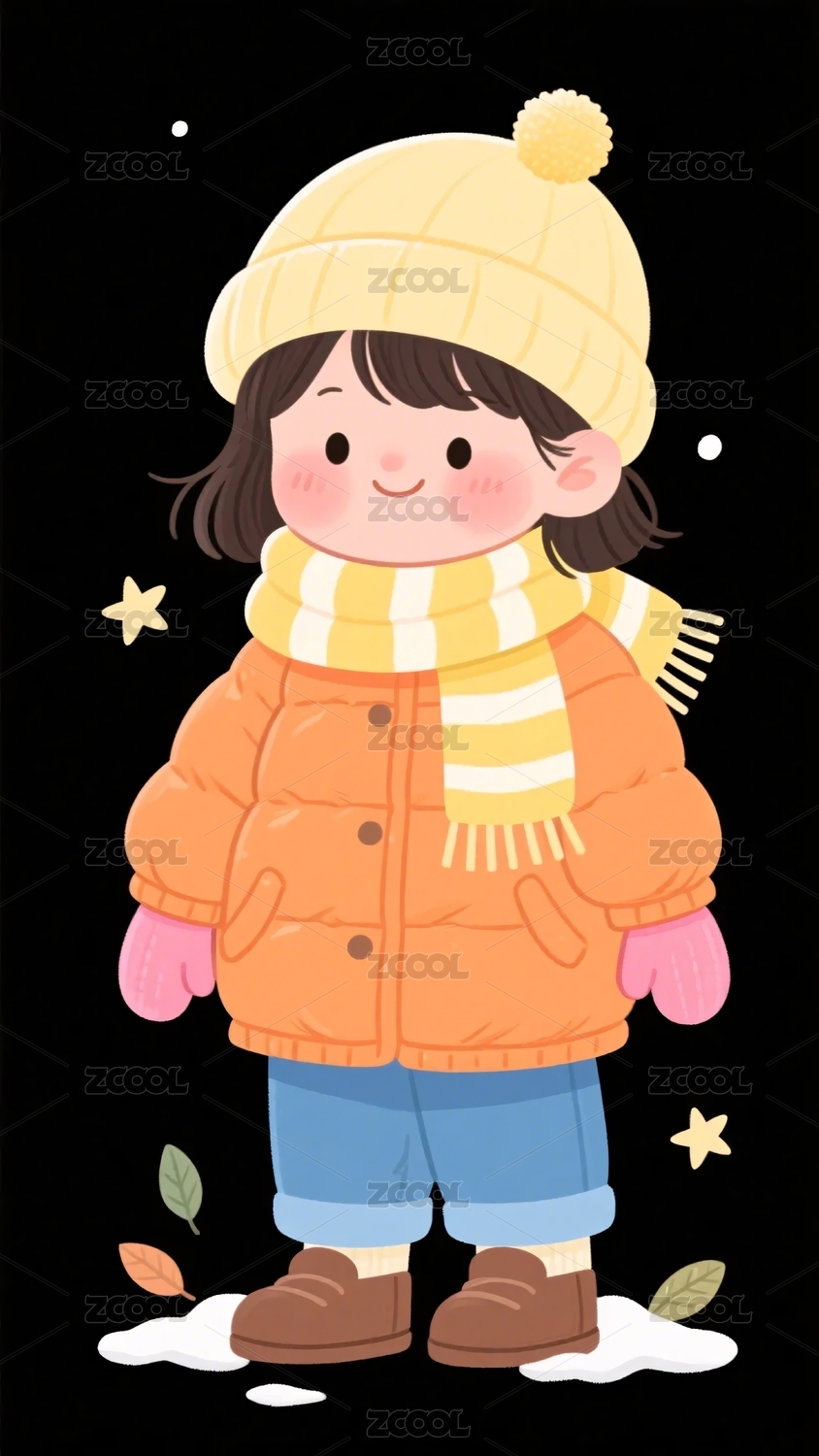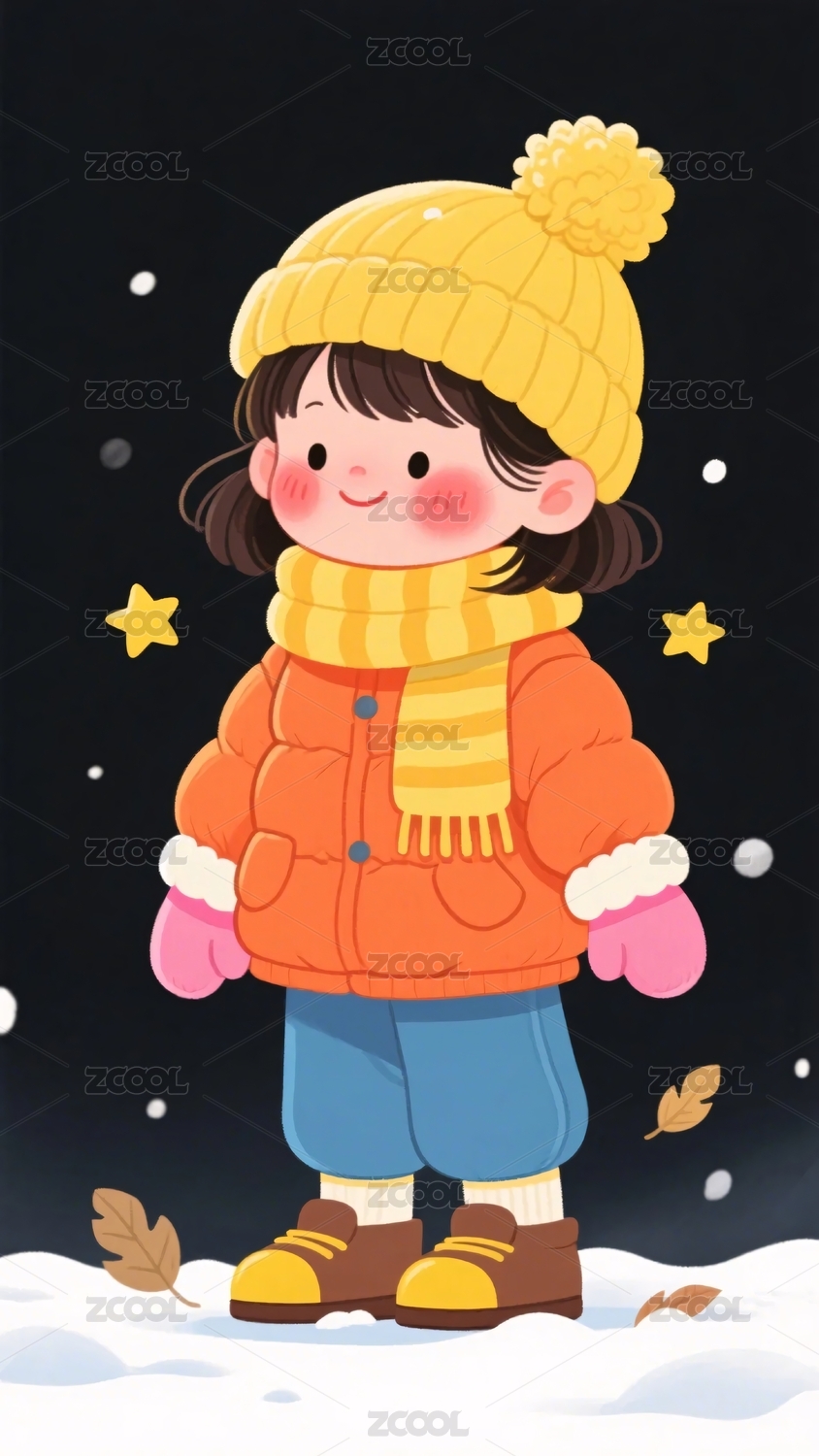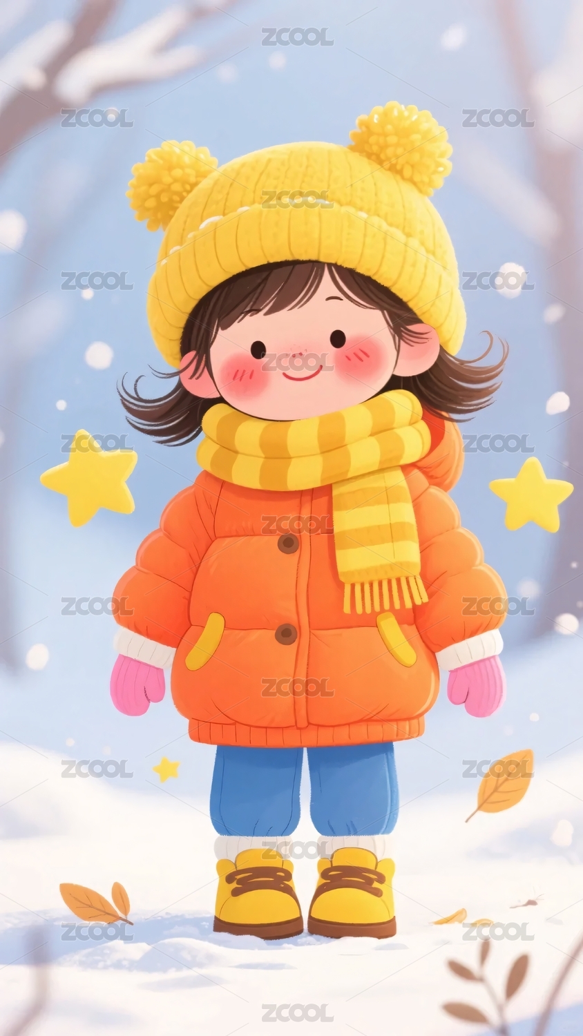 小女孩,雪景,帽子,围巾,棉衣,插画,卡通,冬季,童趣,星星