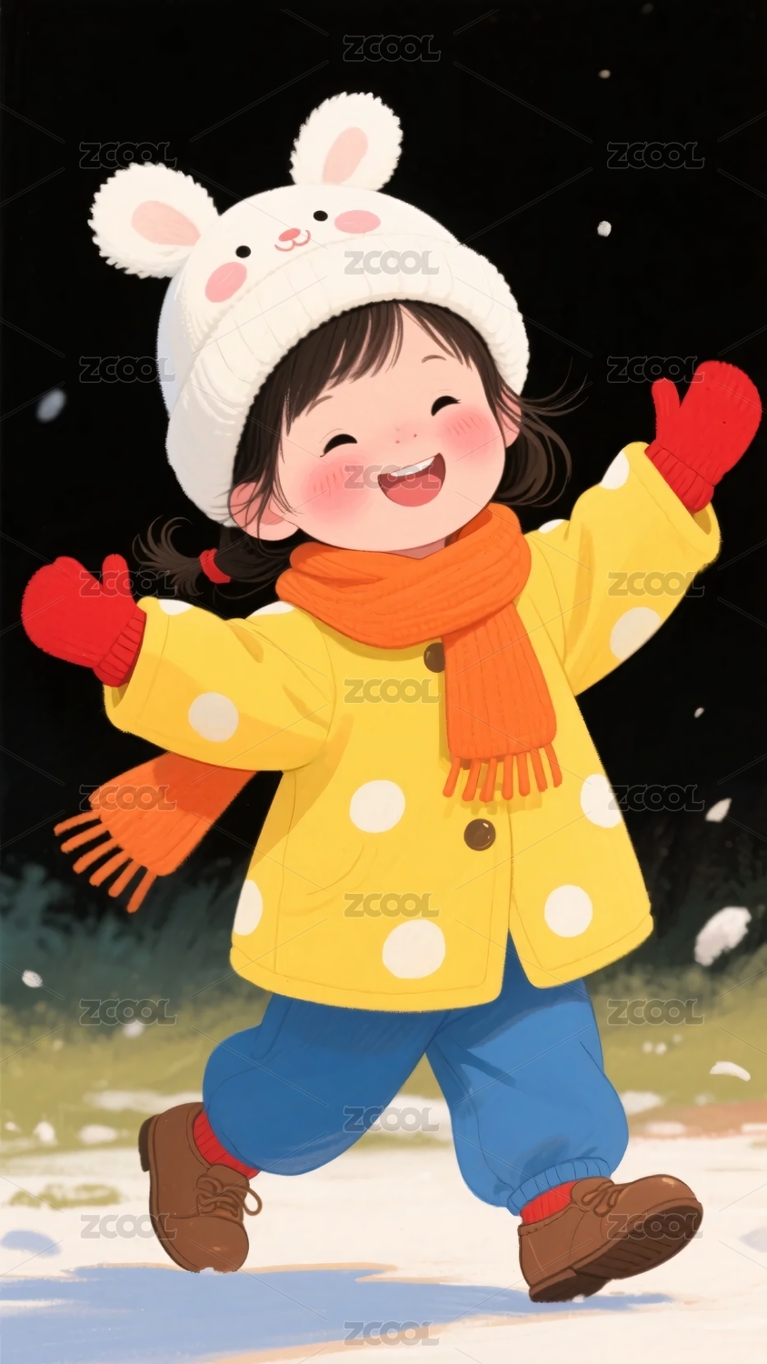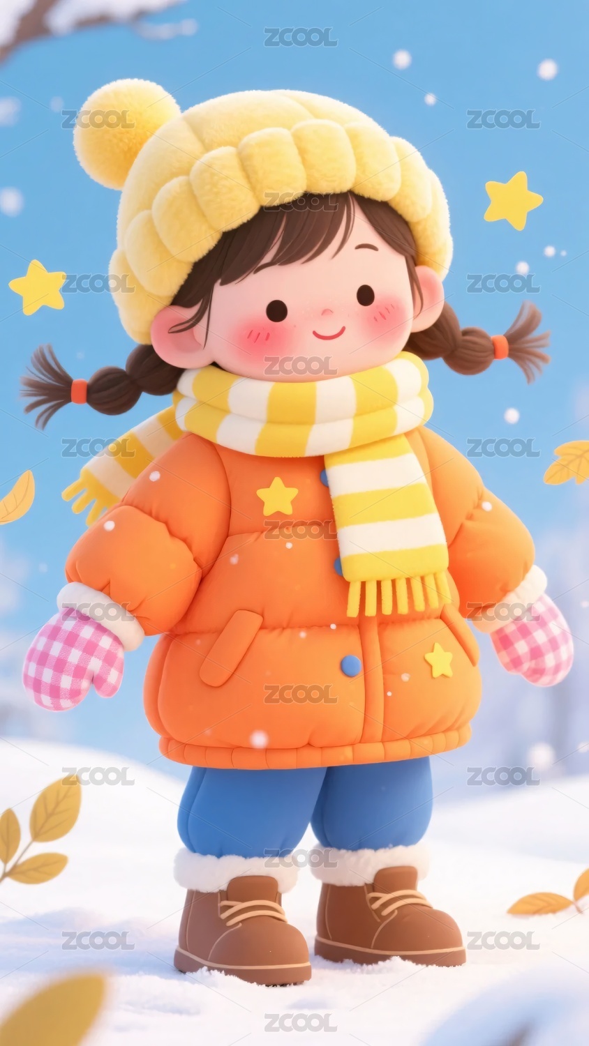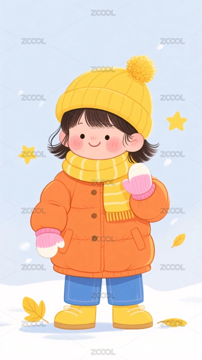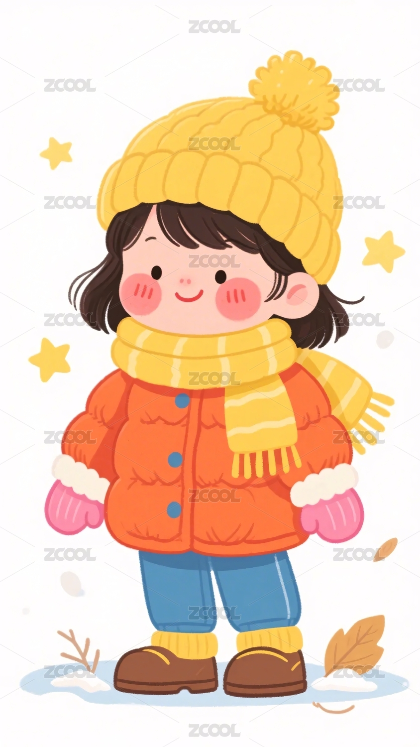 小女孩,雪景,帽子,围巾,棉衣,插画,卡通,冬季,童趣,星星