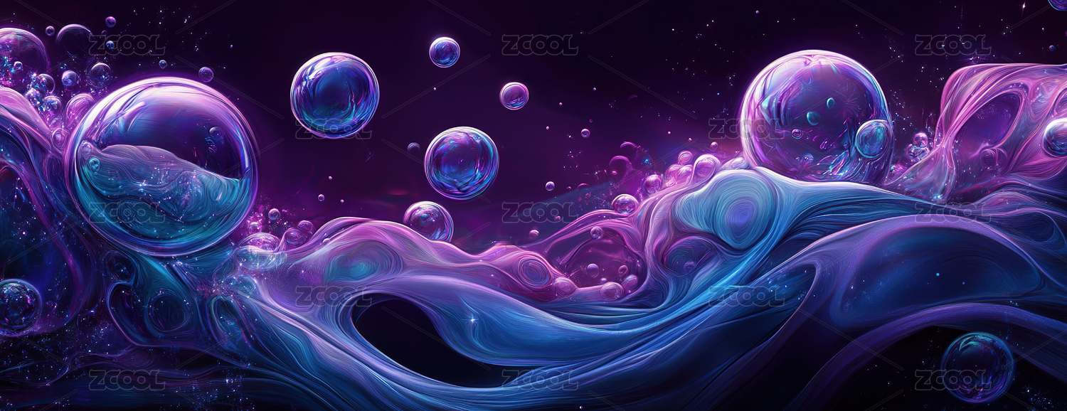 彩虹色液体波浪与泡泡交织的梦幻景象