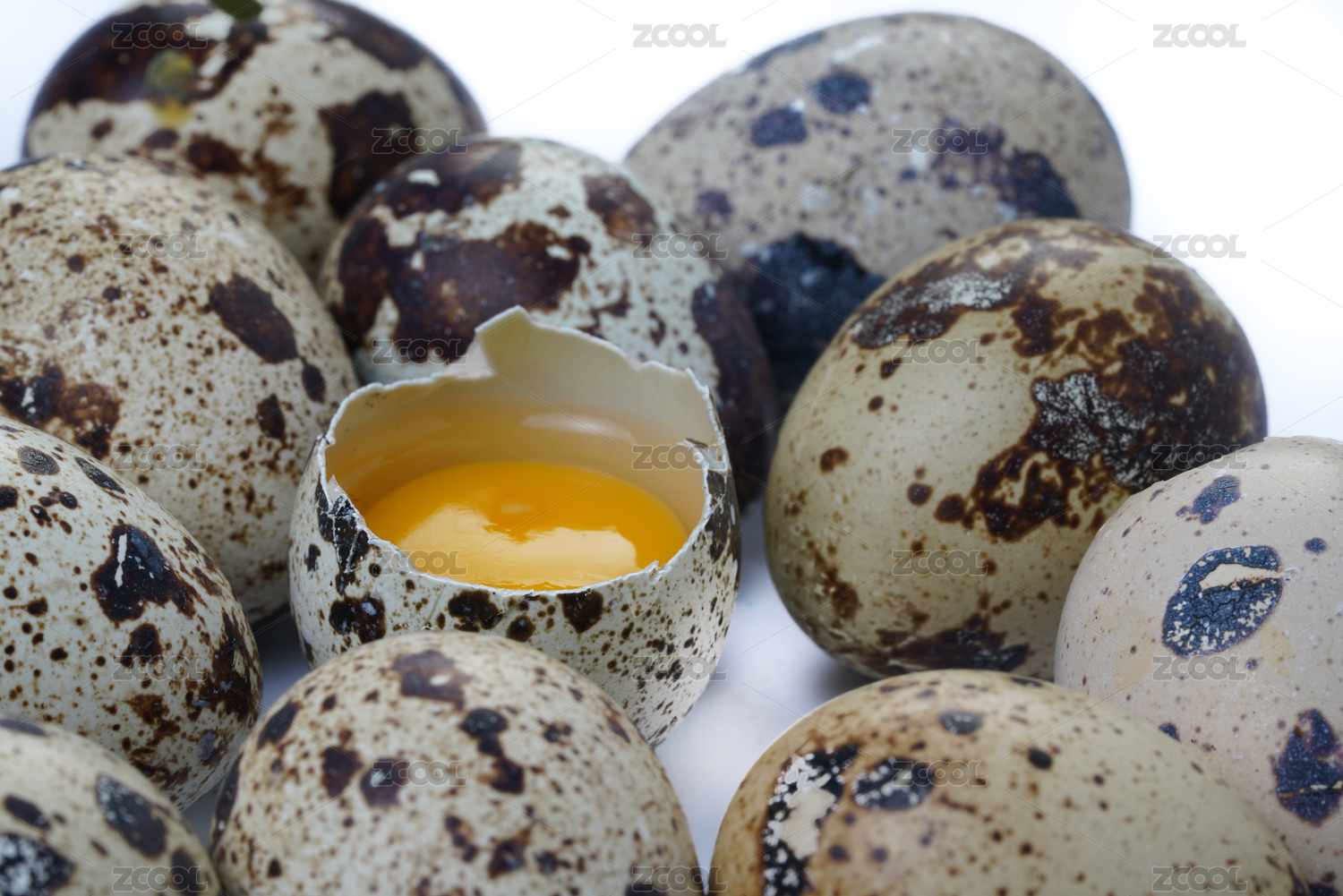 一堆新鲜的鹌鹑蛋其中有一颗敲破露出蛋黄