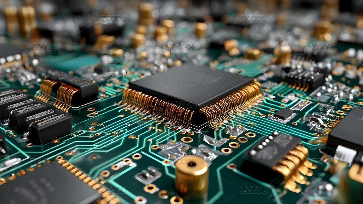 高科技,电路板,微距照片,金色芯片,微组件,路径,哑光表面,银色点缀