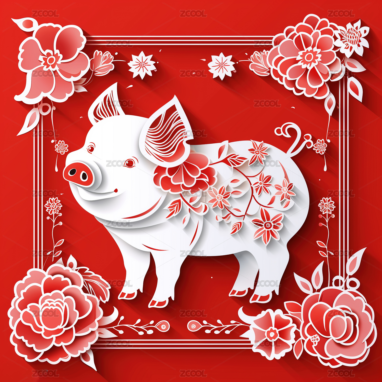 【AIGC】十二生肖猪剪纸插画
