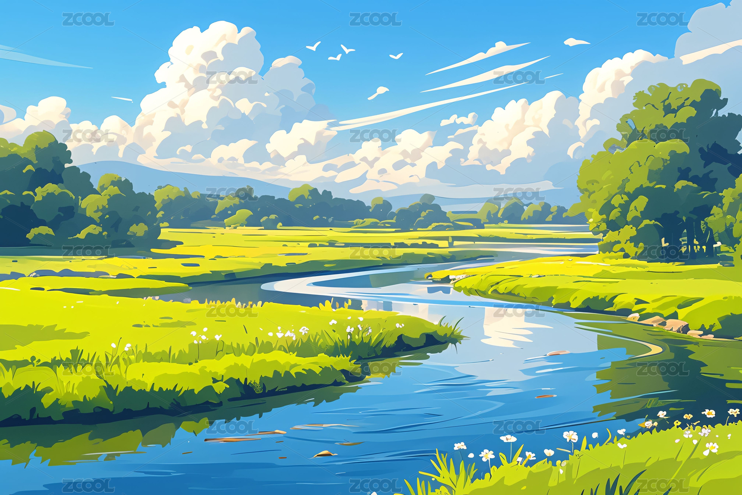 夏天河流风景插画,小暑节气户外旅行概念插