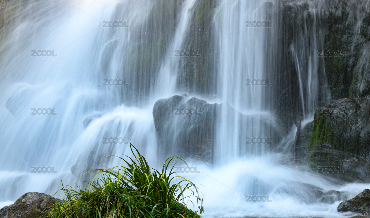 山间瀑布下的翠绿自然景观