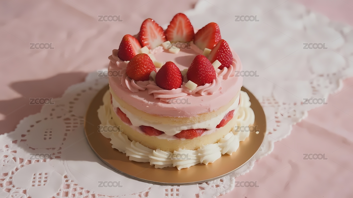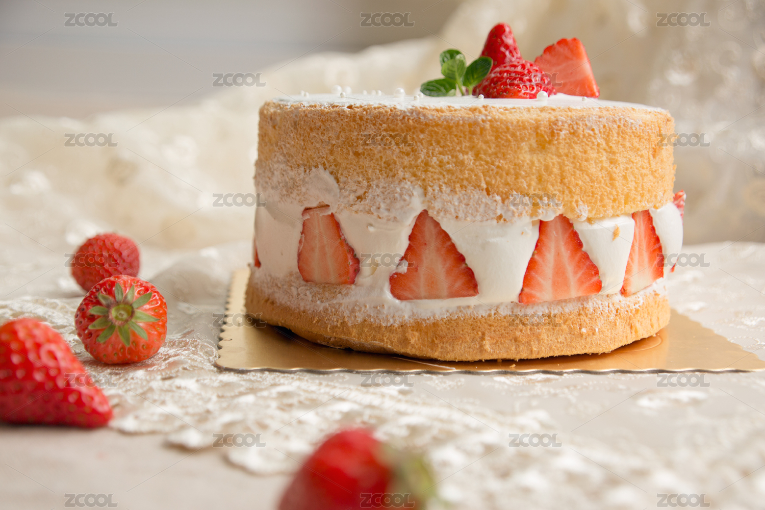 草莓慕斯蛋糕切片配以奶油和新鲜草莓