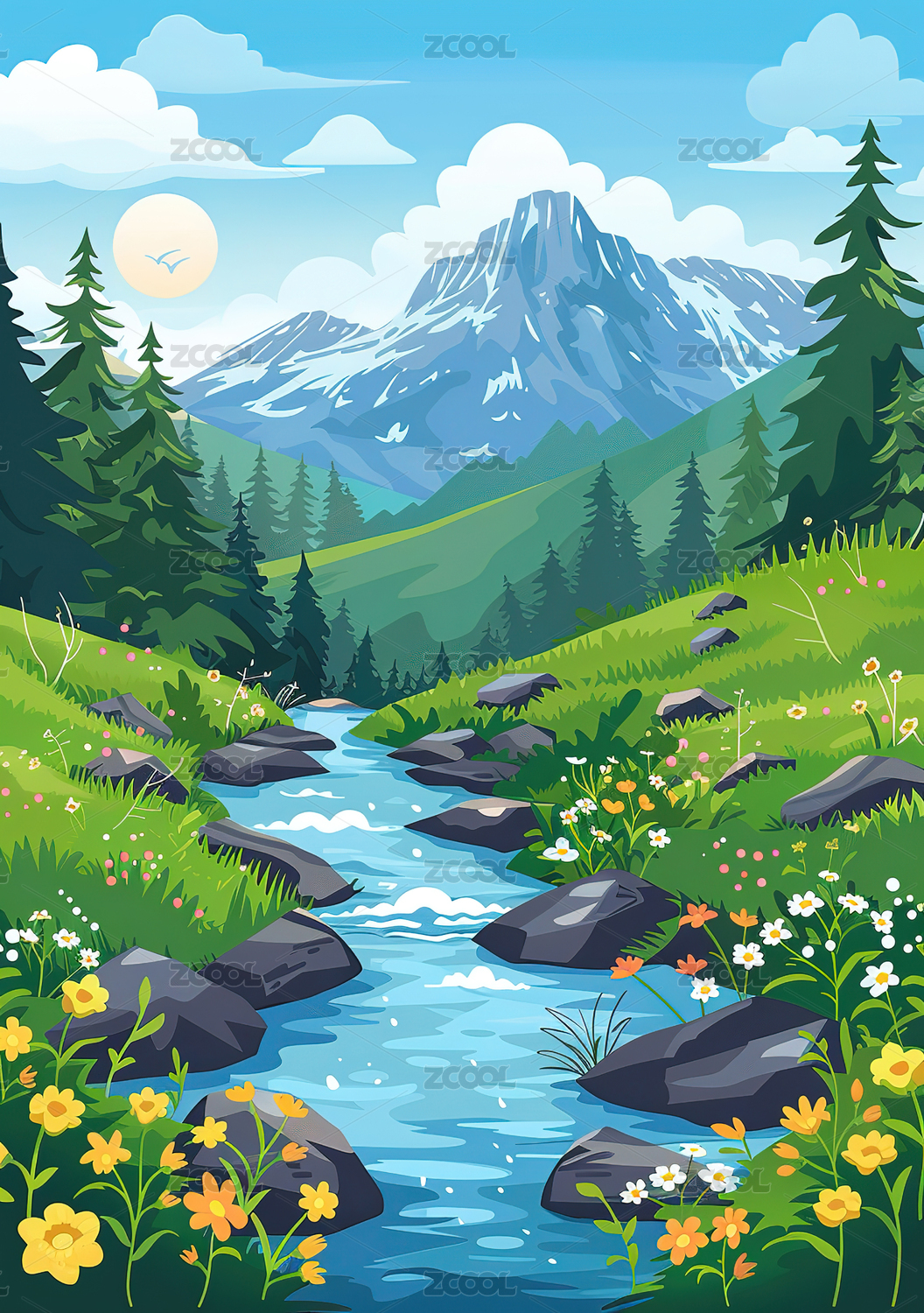 美丽的山河溪流风景插画