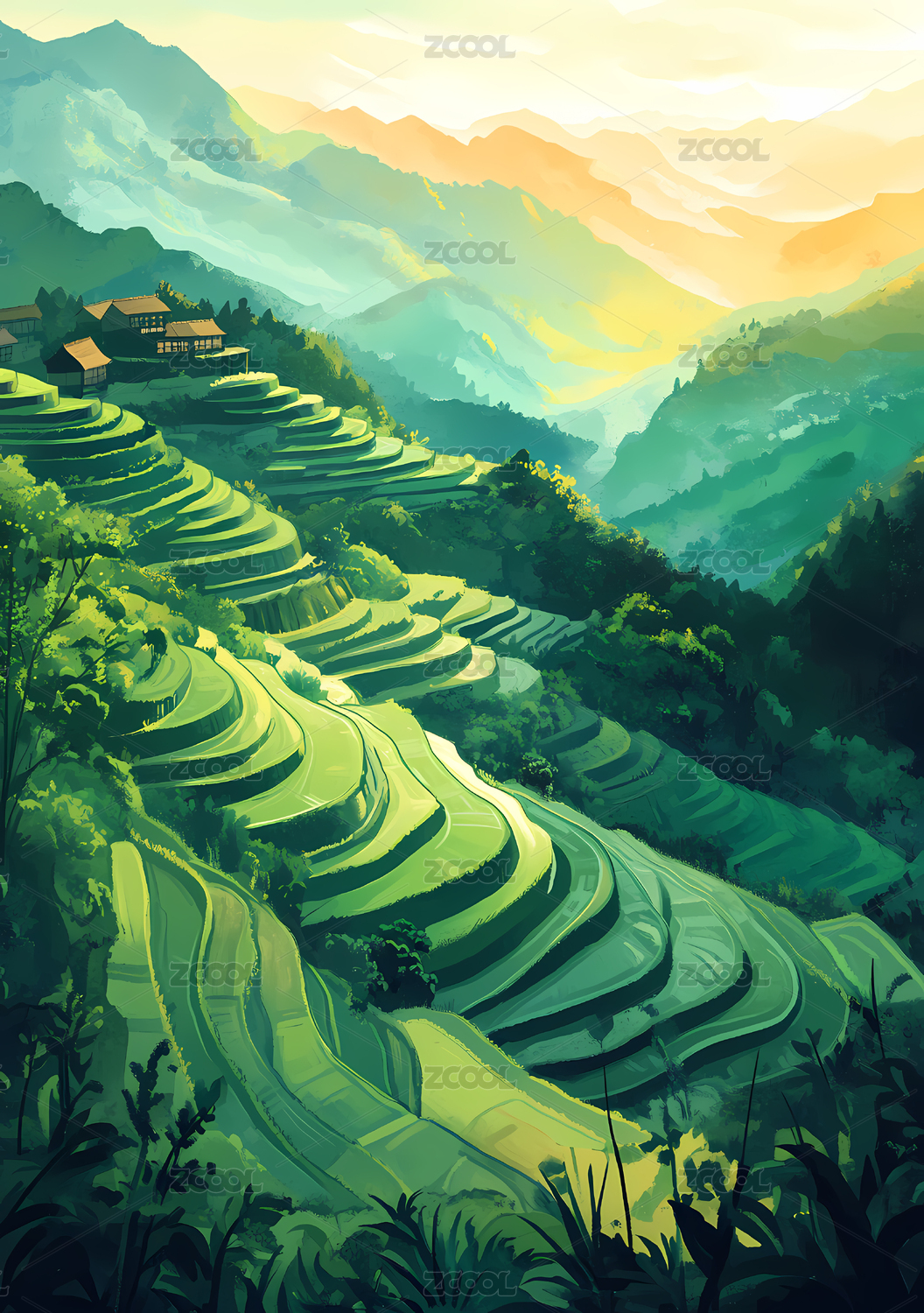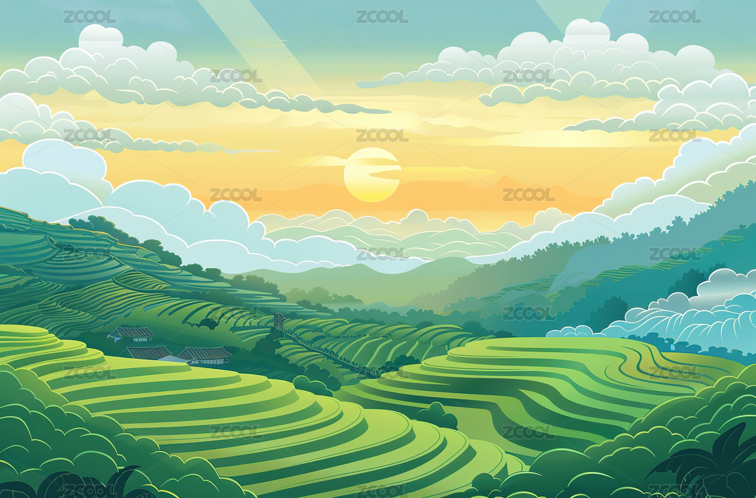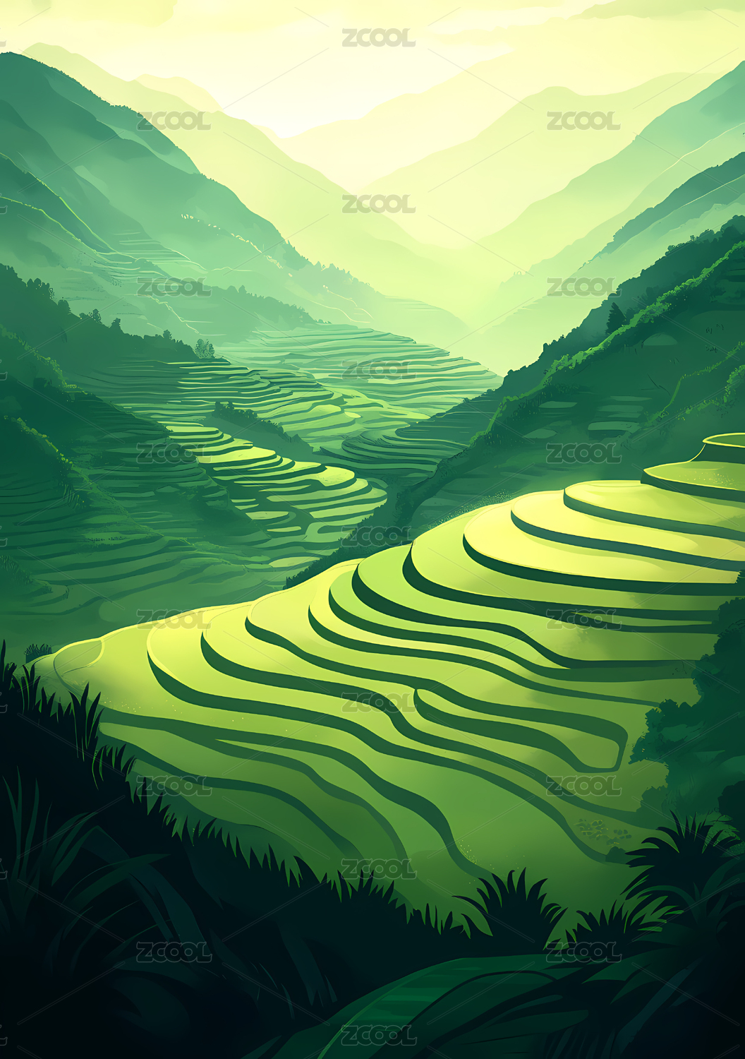 梯田山水风景插画背景