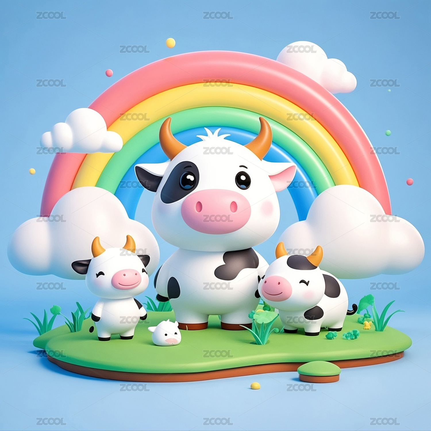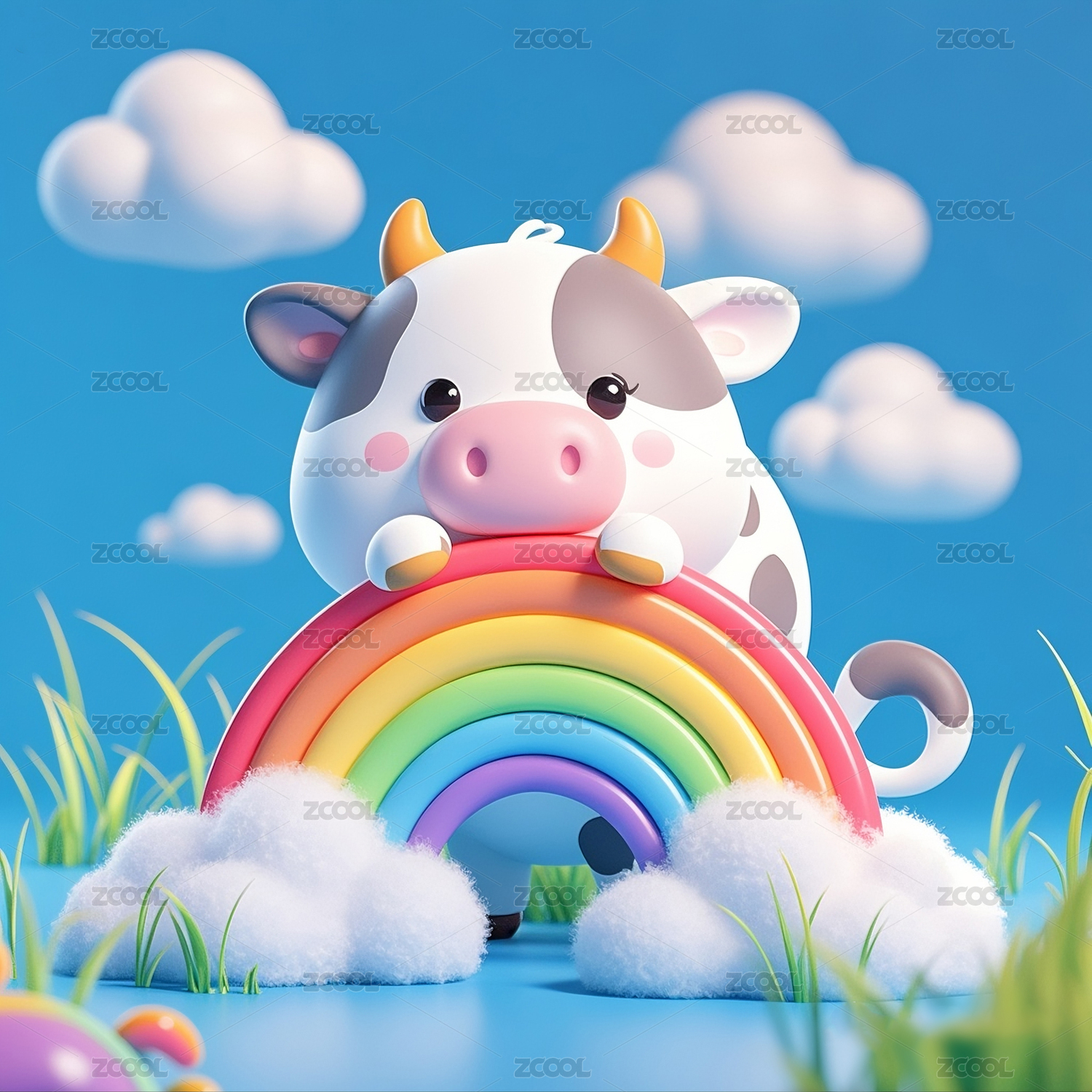 3D动漫风格的毛绒奶牛宝宝和彩虹