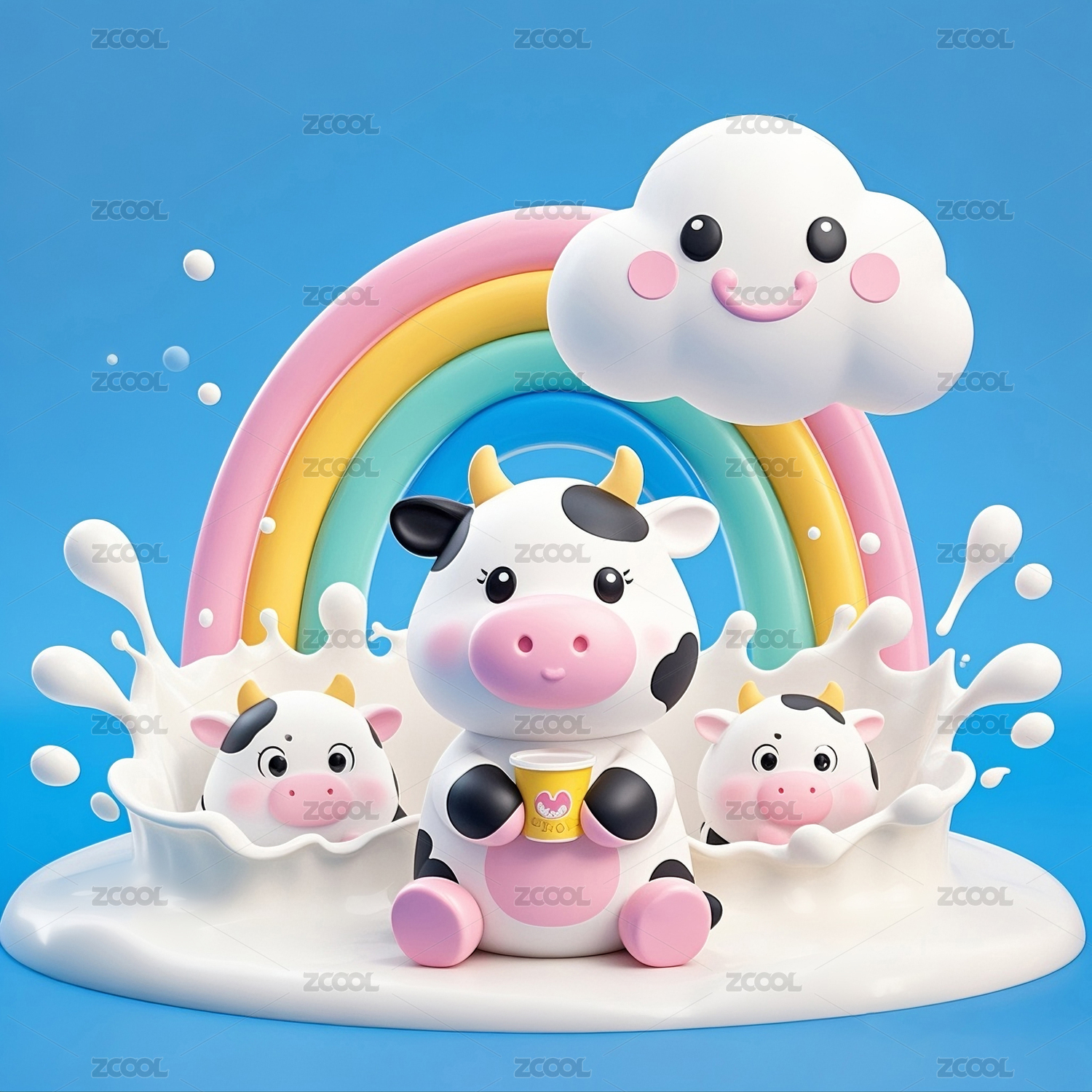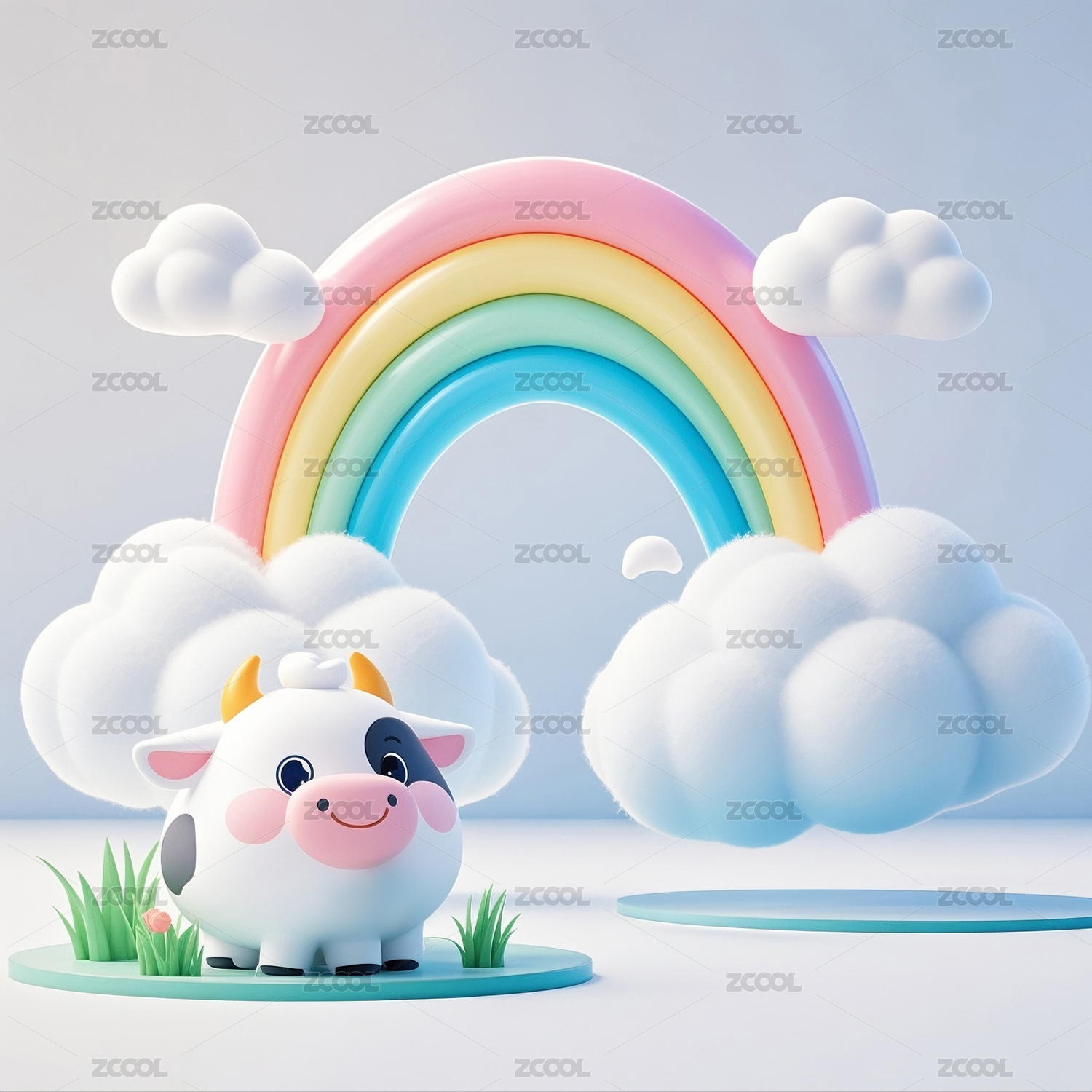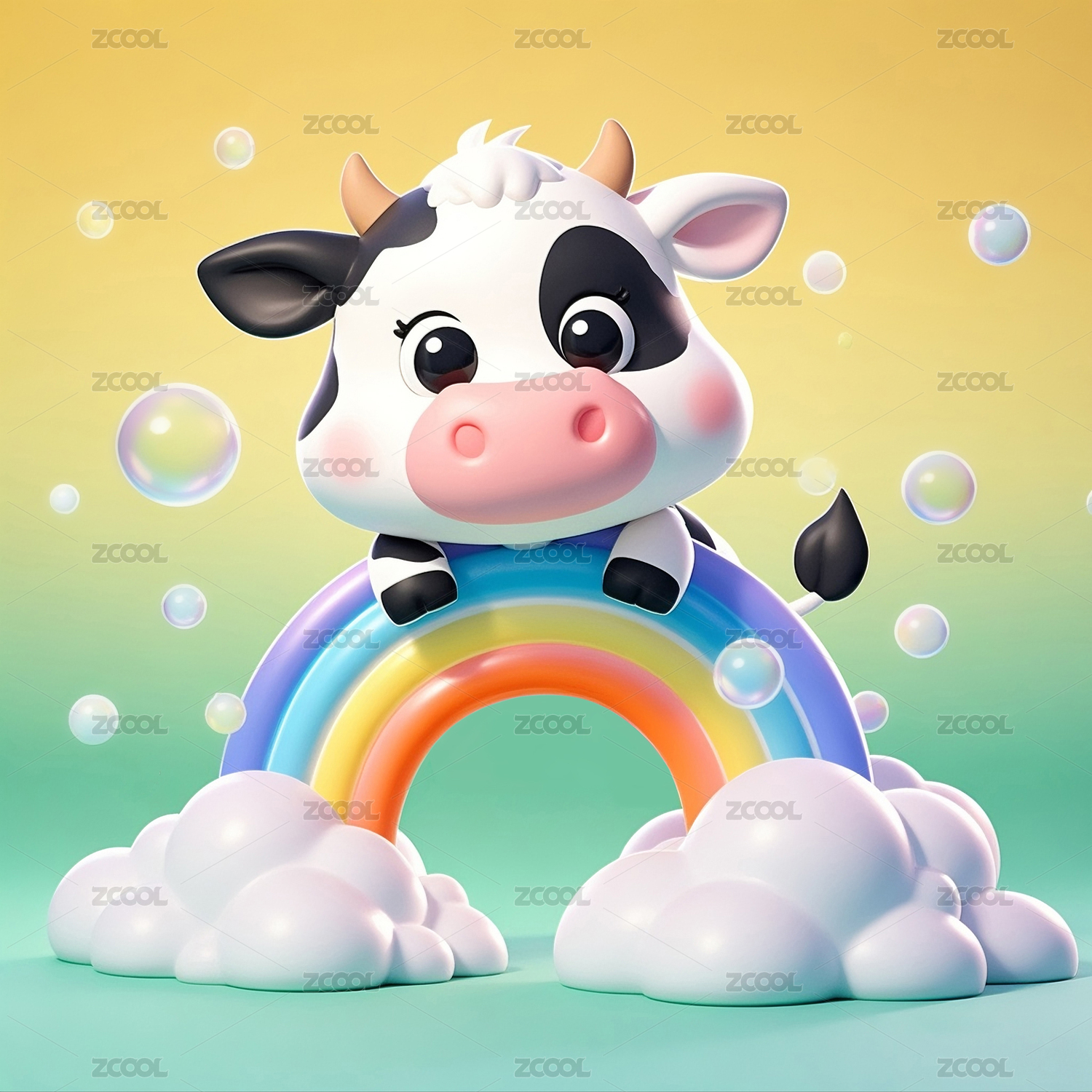 3D动漫风格的奶牛宝宝和彩虹