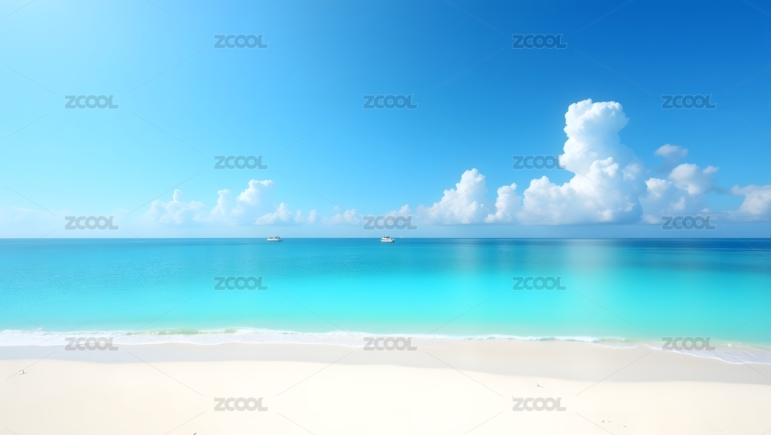 蓝天白云下清澈湛蓝的大海和金黄色的沙滩
