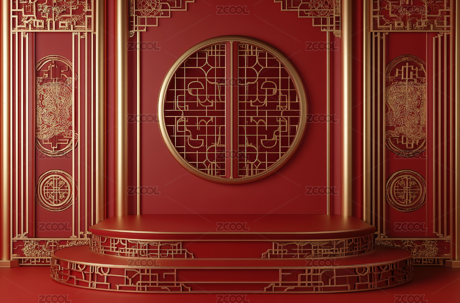 金色,讲台,红色,墙面,装饰,传统,圆形,屏风,镂空,图案