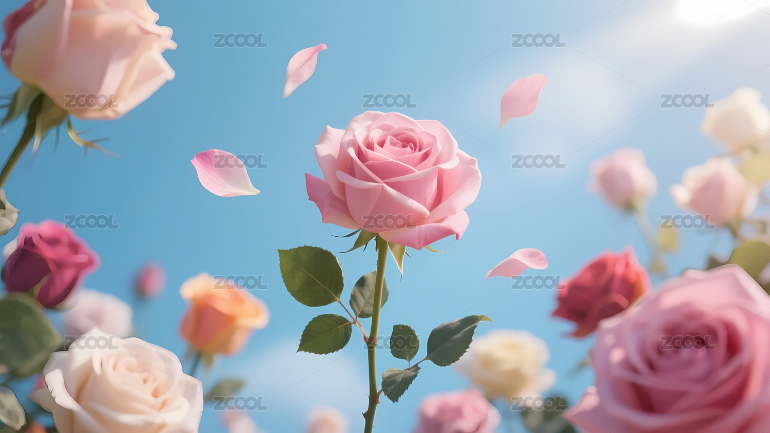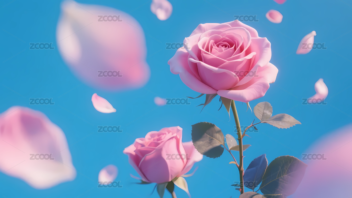 粉色玫瑰与花瓣点缀的天空画面